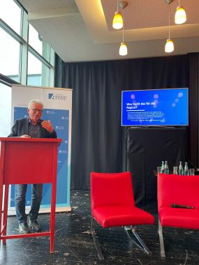 Prof. Dr. Günther Hasinger, Initiator und designierter Gründungsdirektor des Deutschen Zentrums für Astrophysik DZA in Görlitz, erläuterte in seiner Präsentation den Aufbau des Zentrums, welches langfristig mehr als 1000 Mitarbeiterinnen und Mitarbeiter beschäftigen und die Transformation der Region beschleunigen soll. Astrophysikalische Forschungen dienen laut Prof. Dr. Hasinger auch dazu, wissenschaftliche Impulse zu geben, welche für die Entwicklung von Innovationen genutzt werden können. Gesondert ging Prof. Dr. Hasinger des Weiteren auf die hervorragenden Bedingungen, welche durch den Granit in der Lausitz für astrophysikalische Forschungen gegeben sind, ein. Daher plane das DZA, so Prof. Dr. Hasinger, auch ein unterirdisches Forschungslabor im Städtedreieck zwischen Bautzen, Kamenz und Hoyerswerda. Außerdem äußerte er sich lobend über die Herzlichkeit der Einheimischen, für ihn ein Faktor, welcher die Ansiedelung des DZA deutlich erleichtert.