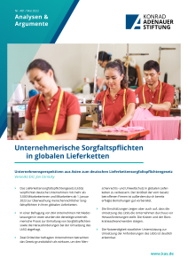 Mit Blick auf die Auswirkungen des am 11. Juni 2021 verabschiedeten deutschen Lieferkettensorgfaltspflichtengesetzes (LkSG) auf deutsche Firmen und ihre Tochtergesellschaften in Asien, hat das Rechtsstaatsprogramm Asien der Konrad-Adenauer-Stiftung die Außenhandelskammer in Singapur mit einer Studie beauftragt. Zwischen dem 14. Oktober und 20. November 2021 wurde von 364 Unternehmen mit Niederlassungen in Asien die derzeitige unternehmerische Praxis zur Einhaltung von Sorgfaltspflichten sowie die Herausforderungen bei der Umsetzung des LkSG abgefragt.