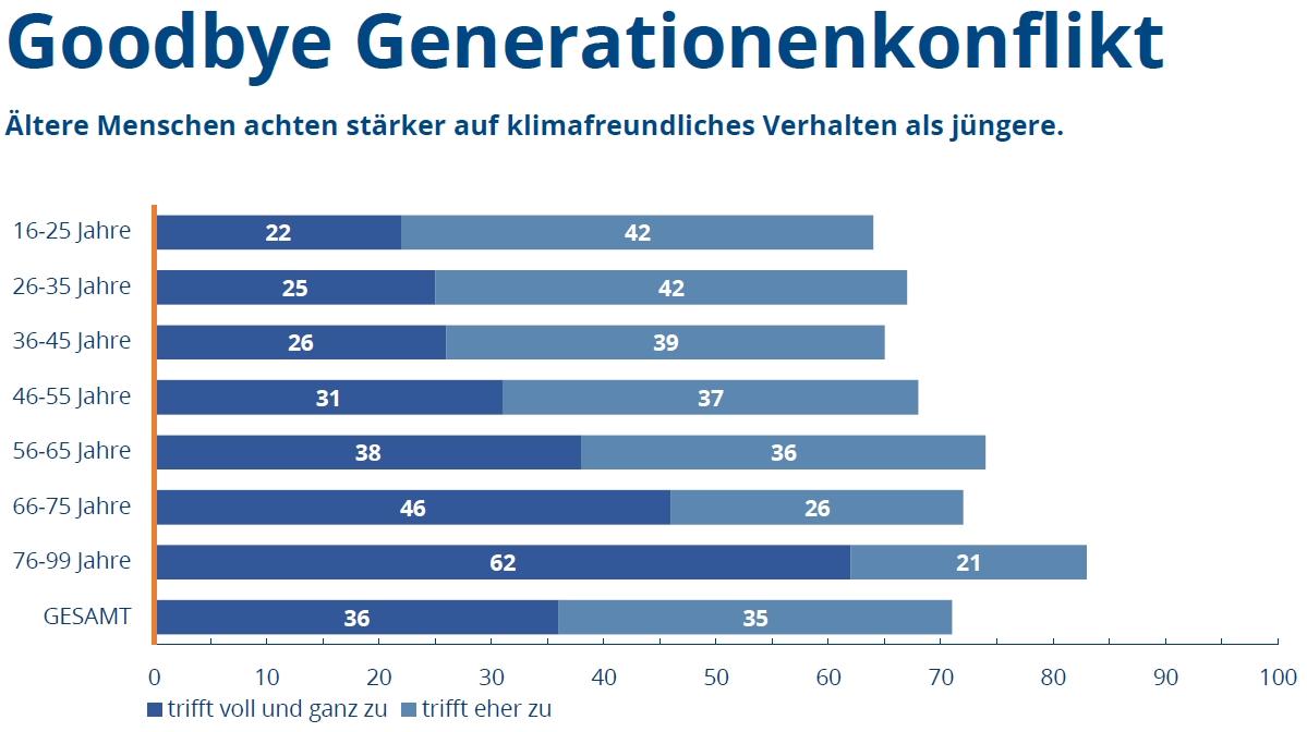 Eine Rolle könnte die Sozialisation in der Nachkriegszeit (über 75 Jahre) oder der Umweltbewegung der 1970er Jahre (über 65 Jahre) spielen. Gleichzeitig werden jüngere Altersgruppen durch die zunehmende Sensibilisierung für Konsumauswirkungen geprägt. Es kann daher nicht ausgeschlossen werden, dass verschiedene Altersgruppen unterschiedlich hohe Maßstäbe für das eigene klimafreundliche Verhalten anlegen. Das Kernergebnis der gesamten Studie lautet: Das Thema Klima hat für die Menschen in Deutschland in allen Altersgruppen eine hohe Wichtigkeit. Ein zuweilen ausgerufener Generationenkonflikt zwischen Alt und Jung zeigt sich in repräsentativen Umfragen nicht.