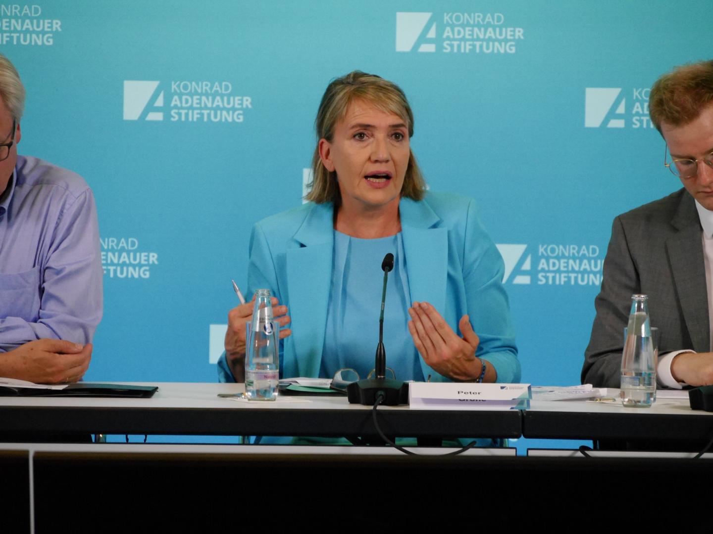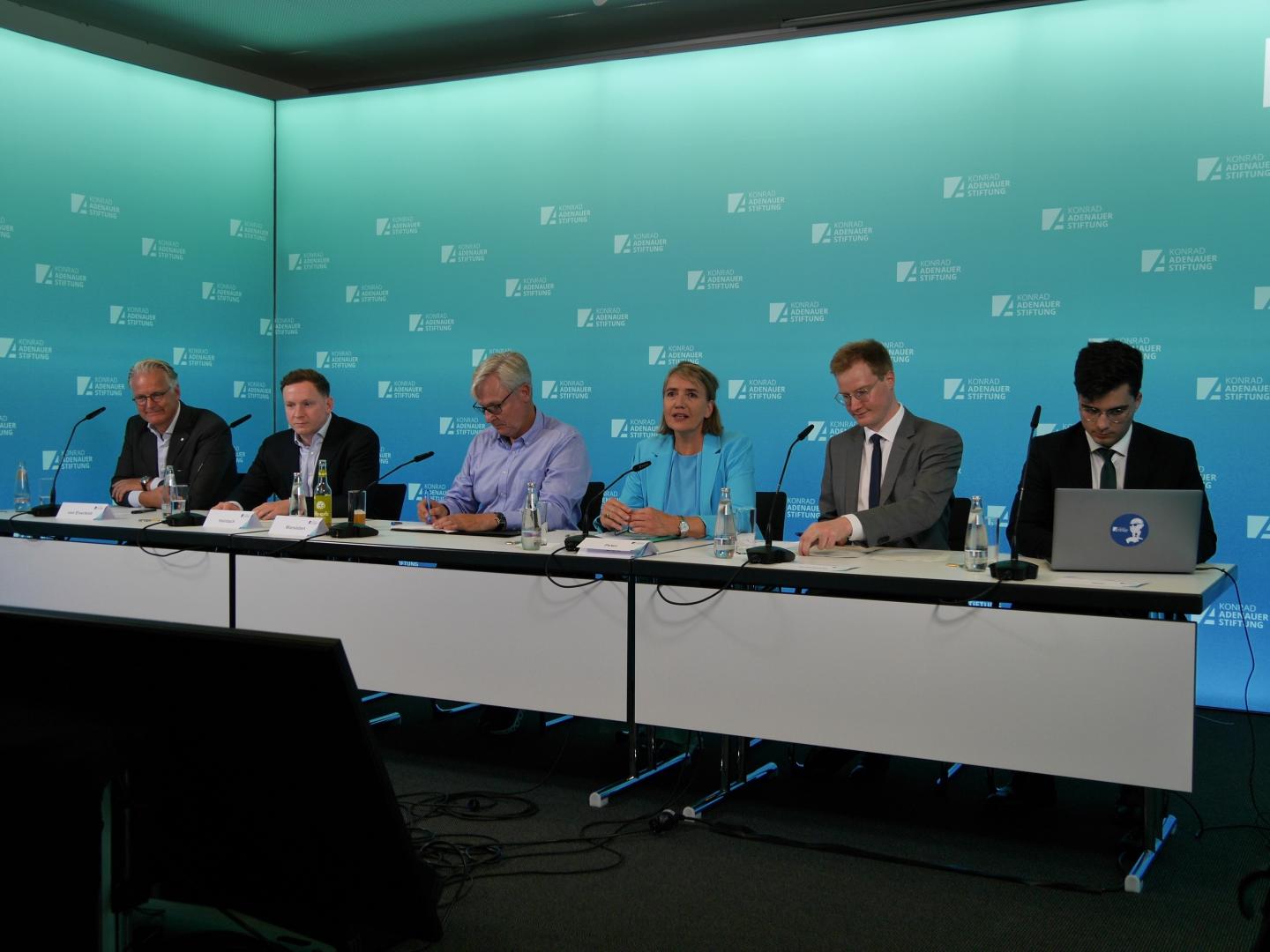 Anschließenden diskutierten Dr. Simone Peter, Bundesverband Erneuerbare Energien, Dr. Martin Wansleben, Deutsche Industrie- und Handelskammer (IHK), Phillip Hainbach, Enapter, und Max Freiherr von Elverfeldt, Familienbetriebe Land und Forst. Für Peter ist die Richtlinie ein „Meilenstein“. Besonders hob sie die verpflichtenden Sektorziele sowie die Einstufung erneuerbarer Energien als überragendes öffentliches Interesse hervor. Sie plädierte dafür, heimische Potenziale stärker zu nutzen und den Fokus nicht nur auf Importe grüner Energie zu legen – auch in Bezug auf Wasserstoffproduktionskapazitäten. Eine erneute energiepolitische Abhängigkeit wie von Russland gelte es zu vermeiden. Kritik äußerte Peter daran, dass anstelle 45 Prozent nur 42,5 Prozent des Energiemixes verpflichtend aus erneuerbaren Quellen stammen muss. Ebenso sei es unverantwortlich, die Anforderungen gerade an Bestandsbiogasanlagen zu erhöhen. Biogasanlagen seien als regionale Backup-Systeme sehr bedeutsam für die Energiewende. Zudem forderte Peter, „Industrie nicht nur hier zu halten, sondern zurückzuholen.“ Dafür müssten das Beihilferecht und Investitionsmöglichkeiten angepasst werden.