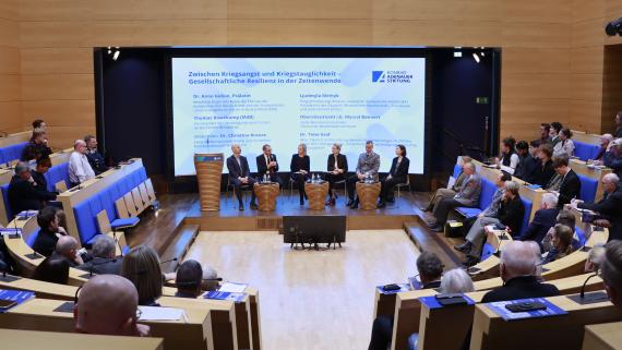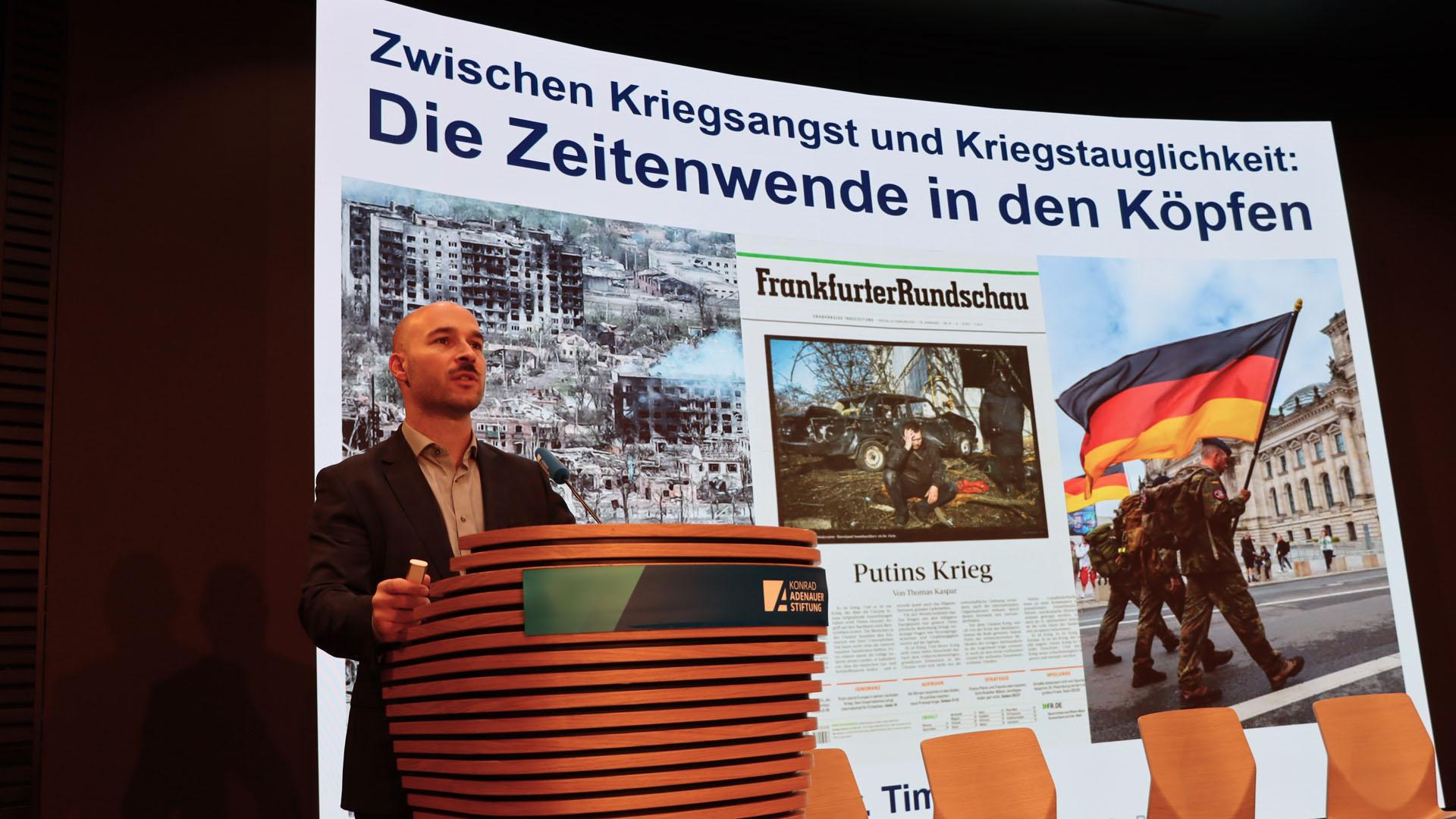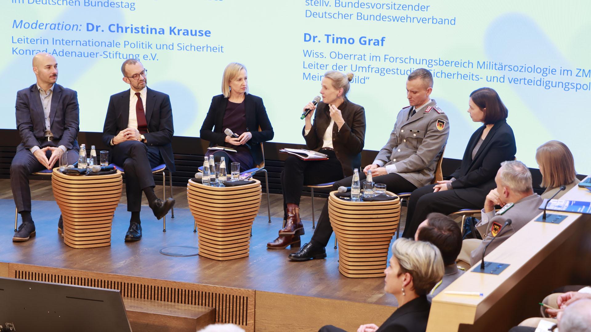 Das Thema scheint die Menschen zu bewegen: Das Forum der Akademie der Konrad-Adenauer-Stiftung war gut gefüllt an diesem Montagabend. Über das Bewusstsein im Land zwischen dem russischen Angriffskrieg, der Regeneration der deutschen Verteidigungsfähigkeit und staatsbürgerlicher Verantwortung für die Gemeinschaft wurde angeregt diskutiert. Anlass der Veranstaltung war zum einen die Präsentation der Umfragestudie „Sicherheits- und verteidigungspolitisches Meinungsbild 2025: Die Zeitenwende in den Köpfen“ von Dr. Timo Graf, vom Zentrum für Militärgeschichte und Sozialforschung der Bundeswehr (ZMSBw). Zum anderen muss gerade auch vor dem Hintergrund der Debatte im Deutschen Bundestag um einen neuen Wehrdienst in unserer Gesellschaft diskutiert werden, wie wir mit der neuen Sicherheitslage umgehen und uns als Bürgerinnen und Bürger einbringen können.