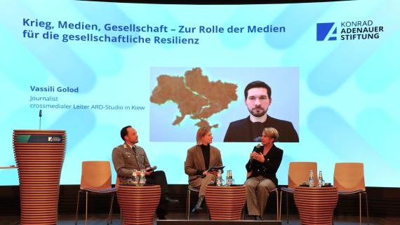 Über eine interaktive Umfrage wurden die Anwesenden im Forum gleich zu Beginn direkt in den Ablauf der Veranstaltung eingebunden. Die Frage, ob man sich durch die Medien ausreichend über Sicherheitspolitik informiert fühle, wurde von zwei Dritteln mit „Ja“ beantwortet und gab ein erstes Stimmungsbild. Parallel zur Abstimmung zeigte ein Einspieler Impressionen und Erinnerungen verschiedener Personen an den Beginn des Krieges und deren Perzeption der deutschen Medienlandschaft. Ausgehend von dem Umfrageergebnis sprach Carolin Unger mit den Presseexpertinnen und -experten Anna Engelke, Vassili Golod und Oberstleutnant Michael Gutzeit über die zentrale Rolle der Medien, über Vertrauen, Kritik und Verantwortung. Vor allem „berichten, was ist“, sei Aufgabe der faktenorientierten Medien, betonte Golod. „Putin versucht, die Herrschaft im Informationsraum zu erlangen“, analysierte Engelke ergänzend dazu. Gegen Verschwörungstheorien und von Russland gezielt gestreuten Zweifeln müssten die öffentlich-rechtlichen Medien arbeiten und stets überprüfbare Fakten im Blick behalten – ungeachtet der Emotionen. Auch wenn man wie Golod selbst in der Ukraine vor Ort sei und im direkten Umfeld Angriffe, Zerstörung und Tote erlebe.