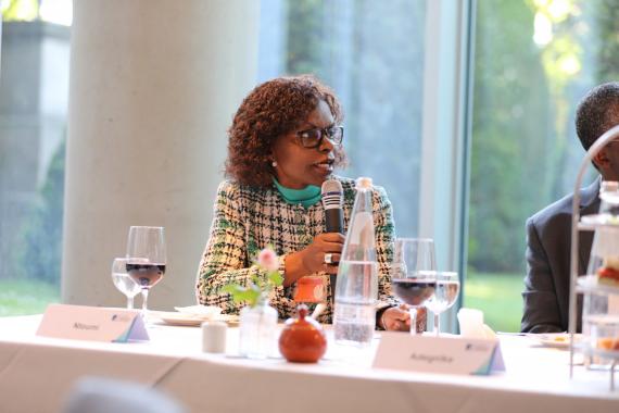 Prof. Francine Ntoumi stellte im Folgenden die Arbeit der FCRM vor. Diese bestehe insbesondere aus den Säulen Forschung, Netzwerke und Ausbildung. Unter anderem habe die FCRM das Programm „Frauen und Wissenschaft“ ins Leben gerufen, mit dem in der Republik Kongo seit 2018 jährlich eine Kampagne für mehr Frauen in der Forschung lanciert wird. Sie betonte zudem die guten Erfahrungen mit gleichberechtigten Partnerschaften zu deutschen Partnern, bei dem es stets einen Austausch auf Augenhöhe gebe, auch wenn die Partner unterschiedliche Kapazitäten mitbringen.