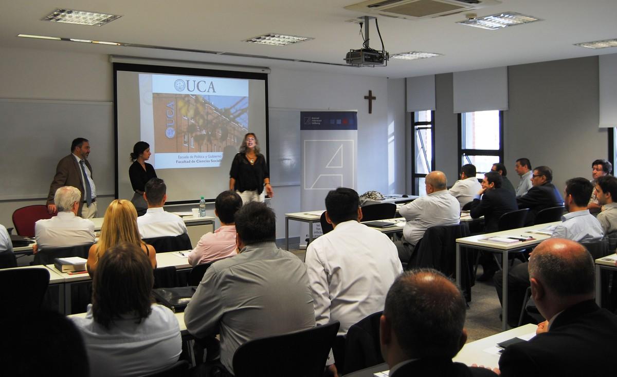 Nachdem Direktorin der Fakultät María Lourdes Puente Olivera und KAS-Koordinatorin Mercedes Ribera-Wansart die Veranstaltung eröffneten, referierte der akademische Direktor des Programms, Sebastián Basso, im ersten Teil des Seminars über die grundlegenden Eigenschaften und Implikationen des Sicherheitsbegriffs. In der zweiten Hälfte sprach Santiago Ferrari, Professor für Internationale Beziehungen an der UCA über die gesellschaftliche Perzeption von Sicherheit in Lateinamerikanischen Ländern.
