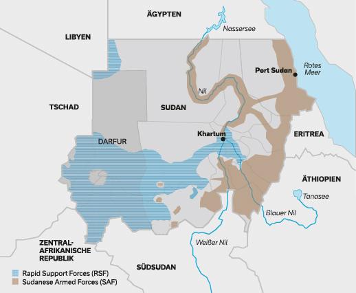 Auch nach 20 Monaten intensiver und landesweiter Kämpfe konnte keiner der beiden Hauptakteure eindeutig die Oberhand gewinnen. Die SAF, deren Gesamtstärke auf mindestens 200.000 Mann geschätzt wird, kontrollieren fast vollständig den spärlich besiedelten nördlichen Teil des Landes einschließlich des Nilflusstals von der ägyptischen Grenze bis zu den umkämpften Städten Khartum und Omdurman sowie den gesamten Küstenabschnitt am Roten Meer mit der wichtigen Hafenstadt Port Sudan, die als provisorischer Sitz der Militärregierung al-Burhans fungiert. Die Grenzgebiete zu Eritrea im Osten und zu Äthiopien im Südosten befinden sich ebenfalls weitgehend unter Kontrolle der SAF. Der bevölkerungsreiche Südwesten und große Teile der Grenze zum Südsudan sowie der Süden der Region Darfur und weite Teile der Grenzregion zum Tschad werden von den RSF kontrolliert, deren personelle Stärke häufig mit 100.000 Mann angegeben wird.