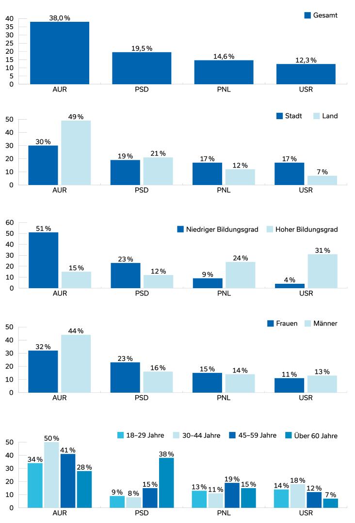 Im ländlichen Raum dominiert die AUR allerdings mit 49 Prozent, während sie im urbanen Raum auf 30 Prozent kommt.9 Je geringer der Bildungsgrad, desto größer ist die Neigung zur AUR und zur sozialdemokratischen PSD. Mit steigender Bildung gewinnen die nationalliberale PNL und die reformistische USR an Stimmen.10 Die markigen Töne der AUR verfangen am stärksten bei Männern. Die PSD wird dagegen überdurchschnittlich oft von Frauen gewählt.11 Auch die Differenzierung nach Alter ist deutlich: Junge Menschen zwischen 18 und 29 Jahren stehen der AUR vergleichsweise skeptisch gegenüber; „nur“ 34 Prozent würden sie wählen. Die PSD kommt auf gerade einmal neun Prozent. Die AUR führt in der Altersgruppe der 30- bis 44-Jährigen mit 50 Prozent. Die PSD schafft auch bei dieser Kohorte acht Prozent und liegt damit mehr als zehn Punkte unter ihrem Gesamtwert – ein deutliches Zeichen, dass die AUR dort massiv an der PSD-Wählerschaft nagt. Die Wählerschaft zwischen 45 und 59 Jahren liegt einigermaßen im Schnitt. Bei den Wählerinnen und Wählern ab 60 liegt die PSD mit 38 Prozent weit vorn; die AUR kommt nur auf 28 Prozent. Klassische, konservative Wähler bleiben bei der vertrauten Position. Die PSD hat damit zugleich ein demografisches Perspektivproblem.12