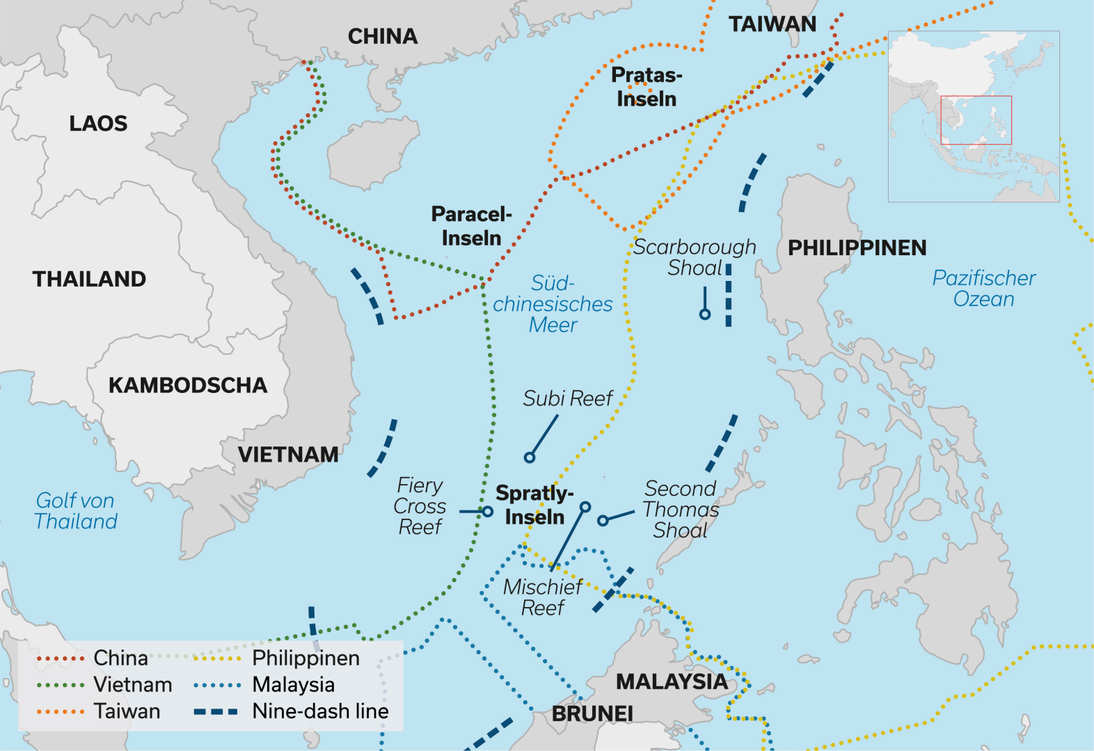 Völkerrechtlich ist die Situation eindeutig. Laut Seerechtsübereinkommen der Vereinten Nationen (SRÜ) verletzt die Volksrepublik China durch ihr Vorgehen immer wieder die Souveränitätsrechte anderer Anrainerstaaten. In einem richtungsweisenden Urteil des internationalen Ständigen Schiedshofs in Den Haag 2016 wurde den Philippinen Recht gegeben und Chinas historische Ansprüche wurden zurückgewiesen. Bis heute erkennt Peking das Urteil nicht an.