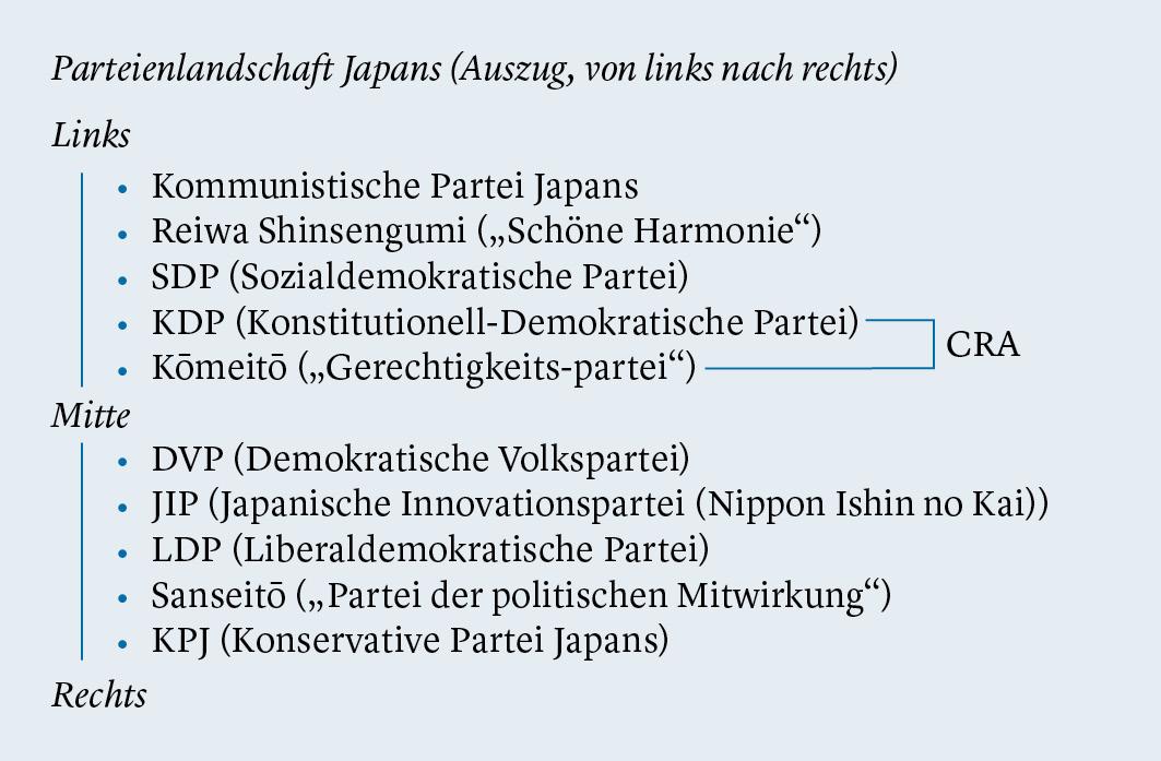 Würde man die bekanntesten japanischen Parteien von ganz links bis ganz rechts aufreihen und einen Strich durch die Mitte der Parteienlandschaft ziehen, so lägen die Kommunistische Partei Japans, Reiwa Shinsengumi (Reiwa; „Schöne Harmonie“), die Sozialdemokratische Partei (SDP) und die Konstitutionell-Demokratische Partei (KDP) links dieser Linie. Die Kōmeitō („Gerechtigkeitspartei“) markierte die linke Mitte, die Demokratische Volkspartei (DVP) die rechte. Rechts davon folgten die Japanische Innovationspartei (Nippon Ishin no Kai; JIP), die Liberaldemokratische Partei (LDP) und Sanseitō („Partei der politischen Mitwirkung“). Am rechten Rand firmierte auf dieser Skala die Konservative Partei Japans (KPJ). Als eigenständige Parteien sind die KDP und Kōmeitō aber nur noch im Oberhaus (Sangiin; „Haus der Räte“) vertreten; für die zweite Kammer des japanischen Parlaments, das Unter- oder Repräsentantenhaus (Shūgiin), haben sie sich im Januar zur Zentristischen Reformallianz (CRA) vereinigt.