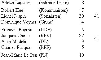 Danach läuft alles auf einen Zweikampf zwischen Jacques Chirac und Lionel Jospin hinaus. Nach den Ergebnissen der gleichen Umfrage erhielte Jospin im zweiten Wahlgang 53% der Stimmen, Chirac nur 47%.