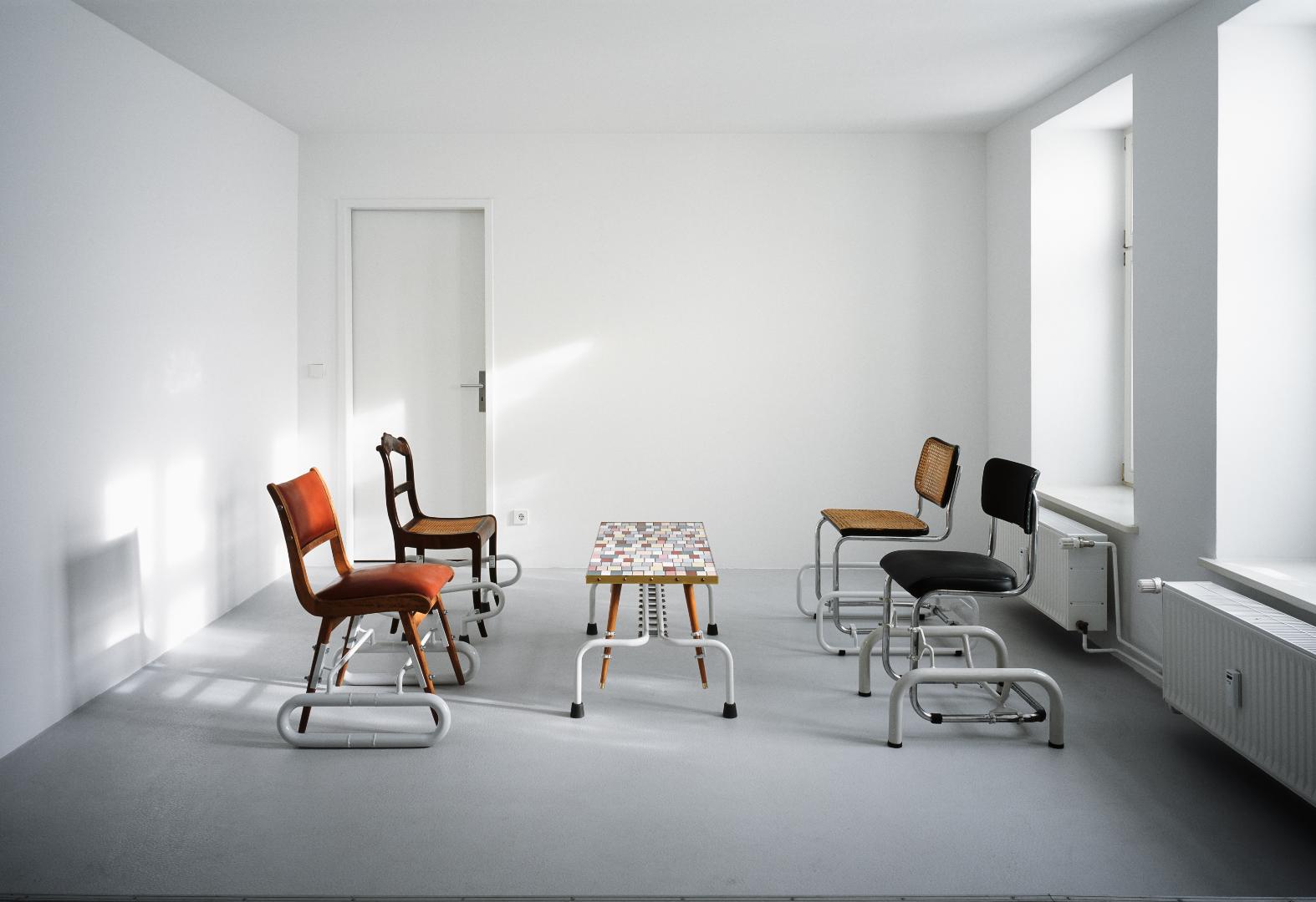 Danke, ehrt mich! Die applizierte Prothese ist jedoch ein Signal, dass diese schönen Entlastungshilfen nicht intakt sind. Selbst ein Betrachter, der gar nichts über Möbelgeschichte weiß, nimmt den Materialunterschied zwischen dem warmen Holz der Möbel und dem Stahl der Zwingen war. Er kann den punktuellen Druck der Berührungsstellen spüren. Er sieht auch, dass ein Bauhausstuhl jünger ist als ein Biedermeierstuhl. Diese Verständnisebene ist die wichtigste, wichtiger als die bildungsbürgerlichen Anekdoten drum herum. Zugegebenermaßen sorgten Thonet, Bauhaus oder Biedermeier früher für Halluzinationen bei mir, sind aber inzwischen eher sekundär.