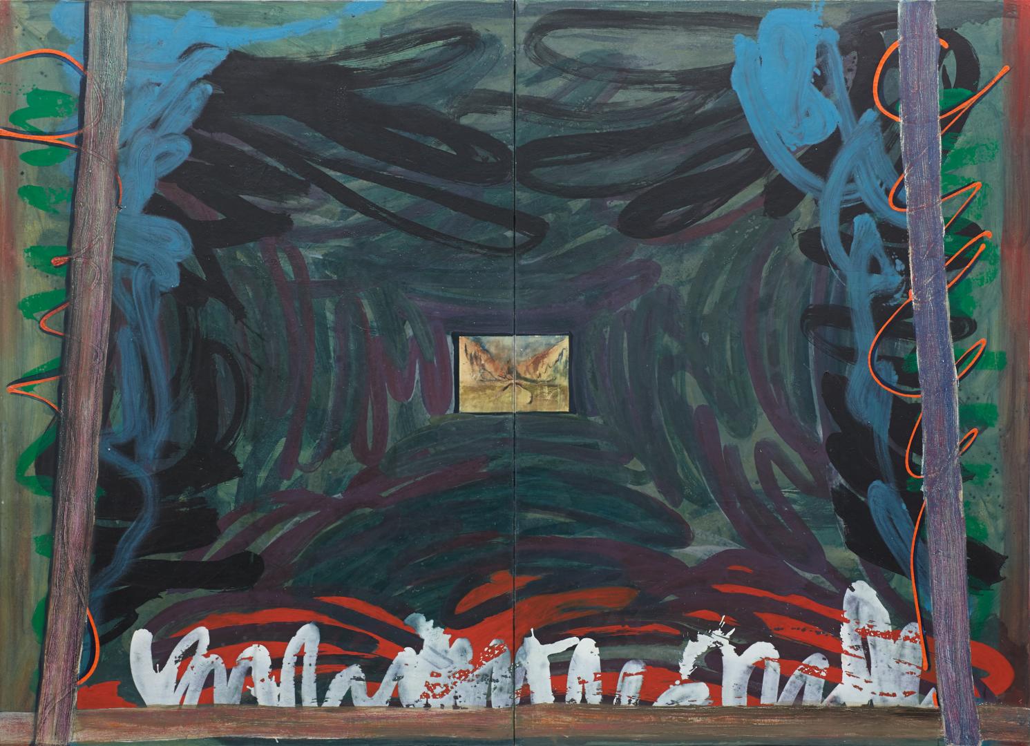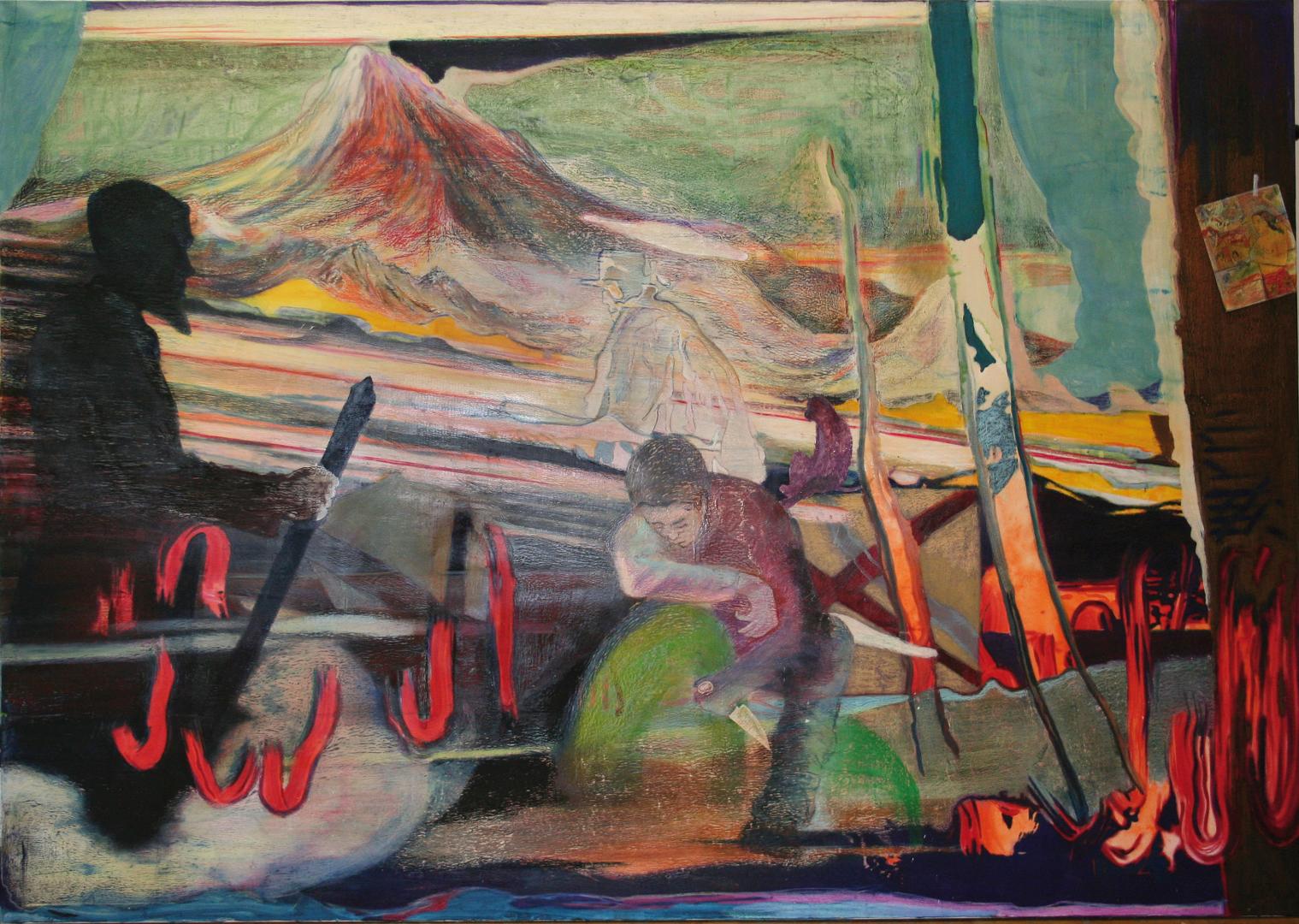 Auf den großen Bildern habe ich Rahmen- oder auch Bühnenstrukturen gesehen, einander überlagernde Schichten. Das kannte ich von deinen älteren Bildern so nicht; da gingen oft Figuren in Landschaften über oder Landschaften in Figuren, aber sie waren in der selben Welt.