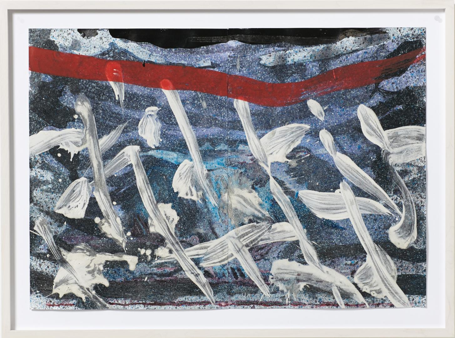 Früher habe ich große Zeichnungen gemacht. Die größte war 2 m x 1,6 m, daran habe ich zwölf Wochen gesessen. Ich bin jeden Morgen früh aufgestanden, wie ein Bauarbeiter zur Arbeit gegangen und habe den ganzen Tag gezeichnet. Das war ein Alptraum. Die Zeichnung sieht toll aus, aber es waren die langweiligsten zwölf Wochen meines Lebens. Ich saß vor dieser riesigen Zeichnung und in mir brodelte es, ich konnte mich kaum konzentrieren. Ich habe fünf Minuten gezeichnet, dann musste ich eine Pause machen, rauchen, Kaffee trinken, dann wieder Anlauf nehmen, mich mit Anspannung hinsetzen und weiter zeichnen. So ging es den ganzen Tag, ich musste pausenlos mit meiner Konzentration kämpfen, um etwas zu machen, was so losgelöst war von meinem Inneren. Irgendwann habe ich verstanden, dass es so nicht geht, dass ich nie ein ruhiger, feiner Zeichner werde. Ich musste etwas ändern, um in einen Rhythmus mit meinem Inneren zu kommen, um einen Blick auf diesen inneren Strom zu erlangen, damit er sich nicht loslöst. Daran tüftele ich immer noch. Ich irre herum und muss ständig Ideen verwerfen, weil ich merke, etwas wird zu einer Art Staffage, ich wiederhole Dinge, weil sie schon einmal gut funktioniert haben. Dann fange ich an, mich zu langweilen oder werde wütend. Wenn ich mich selbst verliere, werde ich wütend. Diese großen, gestischen Sachen kommen dem Aufgewühlten in mir sehr nah.