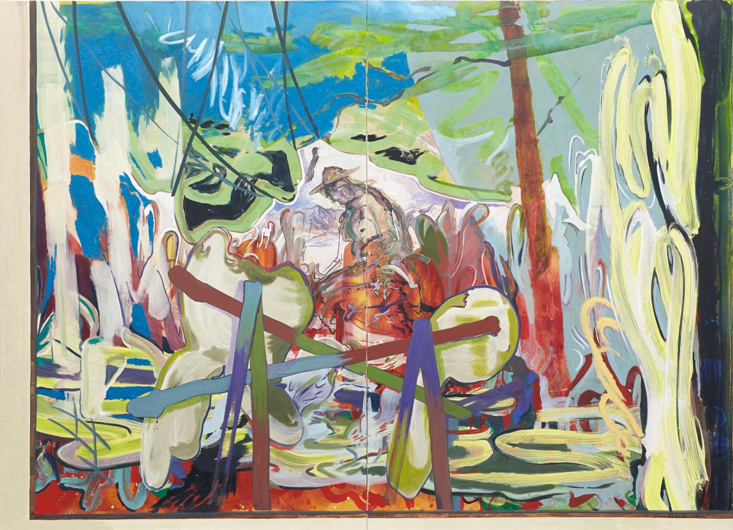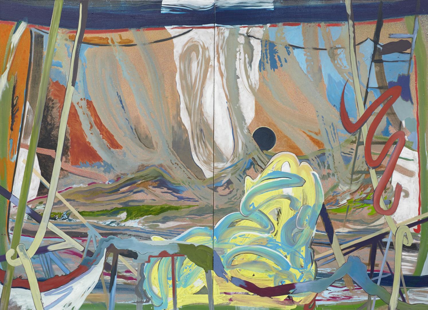 Ich habe das für mich so benannt, dass es etwas gibt, das auf mich einwirkt. Dieser Einfluss kommt nicht von außen, sondern von innen. In meinen Bildern suche ich nach Konstellationen, in denen ich das darstellen kann. Die Landschaften auf meinen Bildern stellen das, was innen passiert, als Außeneinfluss dar. Ansonsten hätte ich nur Hüllen von Figuren, die mit nichts in Korrespondenz stehen. So ist es das Innere, Aufgewühlte durch die Landschaft.