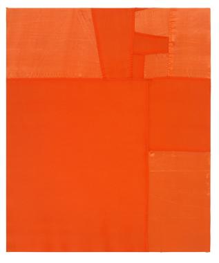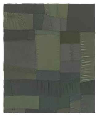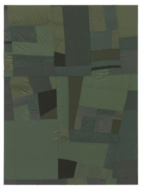 Ja. Die einzelnen Arbeiten der drei Ausstellungen sind Kollagen, die mit einem gewissen Format spielen, wodurch sich Dinge ergeben. Wenn ich eine Bomberjacke zerschneide, habe ich einen Rückenteil, einen Ärmelteil und Vorderstreifen. An sich sind die einzelnen Teile schon Streifen. Ich setze Stück für Stück aneinander. Das ist eine Art Vorwärtsarbeiten mit gegebenen Größen, ich habe nicht viel Entscheidungsspielraum. Ich plane dabei nichts, ich setze nur die einzelnen Teile aneinander. Ich sehe die Arbeit das erste Mal fertig, wenn sie aufgespannt ist. Dann muss ich sie so als fertig akzeptieren. Bei den Fliesen geht es auch wieder viel um das Format: um ein Viereck. Mit einem Schnitt ist man automatisch beim goldenen Schnitt. Man setzt eine Fliese, ein Quadrat, an die nächste und schafft sich damit ein Problem: die nächste wird oben nicht mehr passen. So setzt man Fliese nach Fliese, so, dass alles passt, bis der Rahmen abgeschlossen ist. Das sind ganz logische Vorgänge, gewisse Linien finden sich wieder – das ist eine Art grafisches Denken, das sich in allen drei Ausstellungen spiegelt und sich durchs ganze Buch ziehen wird.