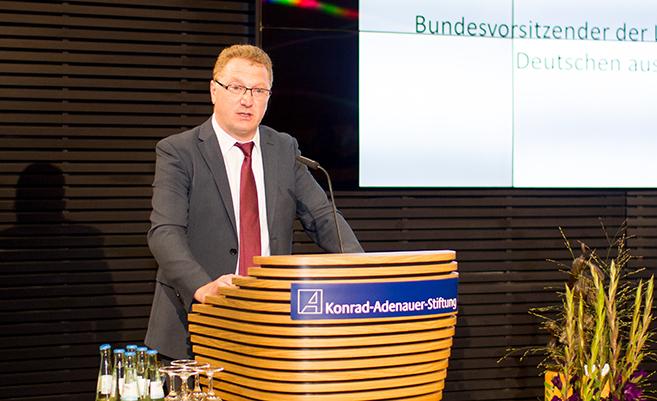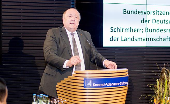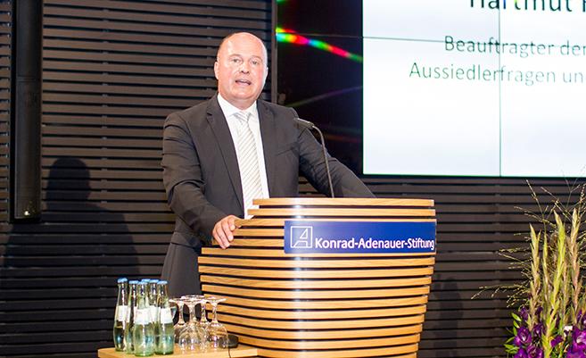 Hartmut Koschyk, Beauftragter der Bundesregierung für Aussiedlerfragen und nationale Minderheiten, sprach von einer „kollektiven Haftung“, in die die Russlanddeutschen mit Stalins Erlass vor 75 Jahren für den vom nationalsozialistischen Deutschland begonnenen Vernichtungskrieg genommen worden seien. Er hob hervor, dass trotz jahrzehntelanger Benachteiligungen die Russlanddeutschen nicht ihrerseits den Vorwurf der Kollektivschuld gegen das russische Volk erhoben hätten. Ursächlich dafür sei zum einen das Mitgefühl der Bewohner wie auch die Friedens- und Versöhnungsleistung der Deutschen aus Russland. Sie habe es ermöglicht, dass der „Teufelskreis aus Rache und Gegenrache kein unausweichliches Schicksal ist“, sondern durch Anteilnahme und christliche Vergebung durchbrochen werden konnte, so Koschyk.