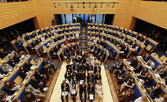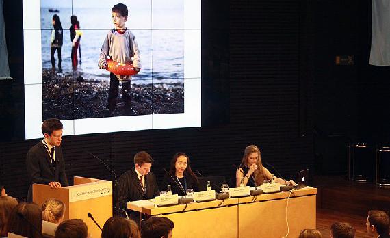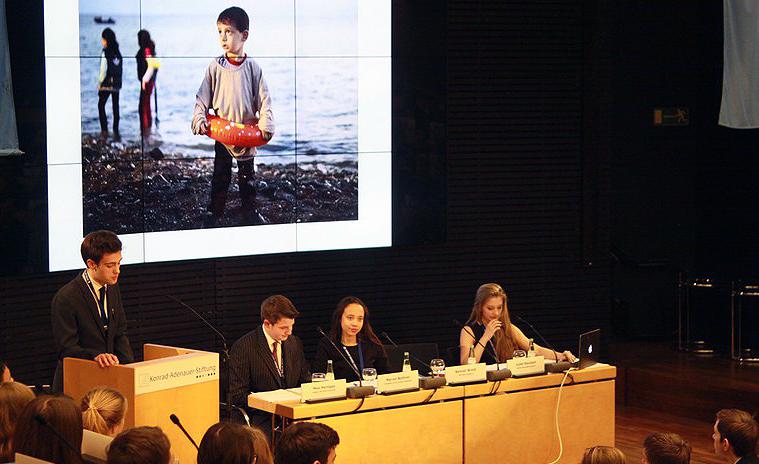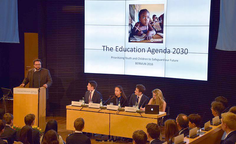 “Prioritize Youth and Children to Safeguard our Future” lautete das Motto der dreitägigen Veranstaltung. In den Rollen als VertreterInnen der Mitgliedstaaten der UN-Vollversammlung, des Sicherheitsrates oder der Ländergruppen bezogen sie Stellung zum Konferenzthema, entwarfen Resolutionsbeschlüsse und übten sich in Verhandlungsführung und Konfliktlösung. Die Verständigung erfolgte in englischer Sprache. Nach einer Begrüßung durch Herrn Kleine-Kraneburg, Leiter der Akademie der Konrad-Adenauer-Stiftung, führte Brian Salzer, Schulleiter der John F. Kennedy-Schule, mit einem Zitat von John F. Kennedy ein: “We are the individuals needed to solve the issues of today. We are the future”.