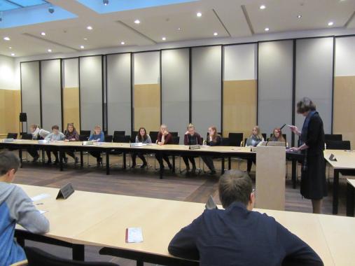 Danach besuchte die Klasse das Auswärtige Amt. Ein Diplomat erläuterte seinen Arbeitsalltag und stellte seinen beruflichen Werdegang dar. Auch hier konnten die Schüler zahlreiche Fragen stellen.