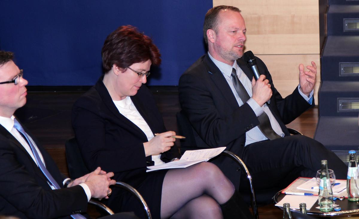 Vereinfachte Verfahren, Fachleute und ein Konjunkturprogramm: Florian Graf MdA, Vorsitzender der CDU-Fraktion im Abgeordnetenhaus, stimmte der Senatorin zu: „Wir müssen die Verfahren beschleunigen.“ Für Graf liegt die Lösung auch im radikalen Abbau von Vorlage- und Beteiligungspflichten, denn „es kann nicht sein, dass man durch x Gremien muss.“ Er würde gern die bei den jüngsten Flüchtlingsbauten angewendeten vereinfachten Genehmigungsverfahren auf den Schulbau übertragen. Vor allem bräuchten die Verwaltungen mehr Fachleute. Für die nächsten fünf Jahre könnten zudem in einem Konjunkturprogramm durch die Bündelung verschiedener Finanztöpfe zwei Milliarden Euro in den Schulbau fließen.