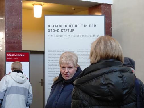 Im Stasimuseum nahm der Referent Bezug auf die Arbeitsweise des Ministeriums für Staatssicherheit. Das Büro vom Chef der Staatssicherheit Erich Mielke, das im Originalzustand erhalten ist, wurde angesehen. Während des Besuchs nahm die Gruppe an einem Zeitzeugengespräch teil.