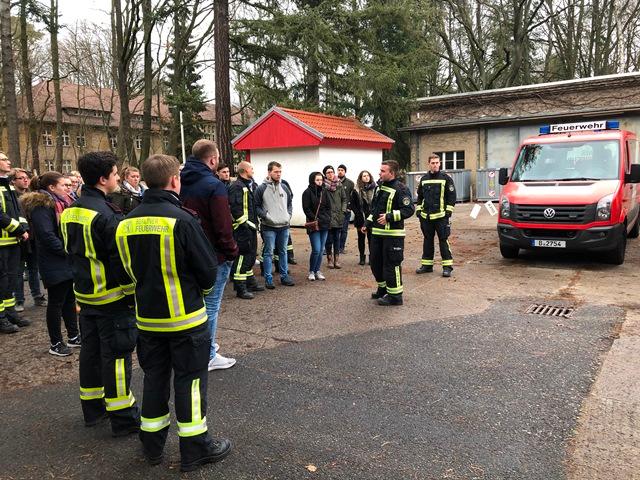 Im riesigen Außenbereich wurde ein Rettungswagen besichtigt und erläutert, die Gruppe konnte den Berliner Auszubildenden bei Feuerwehrübungen zusehen, von der Höhenrettung über Brandeinsätze bis hin zu komplizierten Verkehrsunfällen, mit Beteiligung von Bussen, Straßenbahnen und S-Bahn.