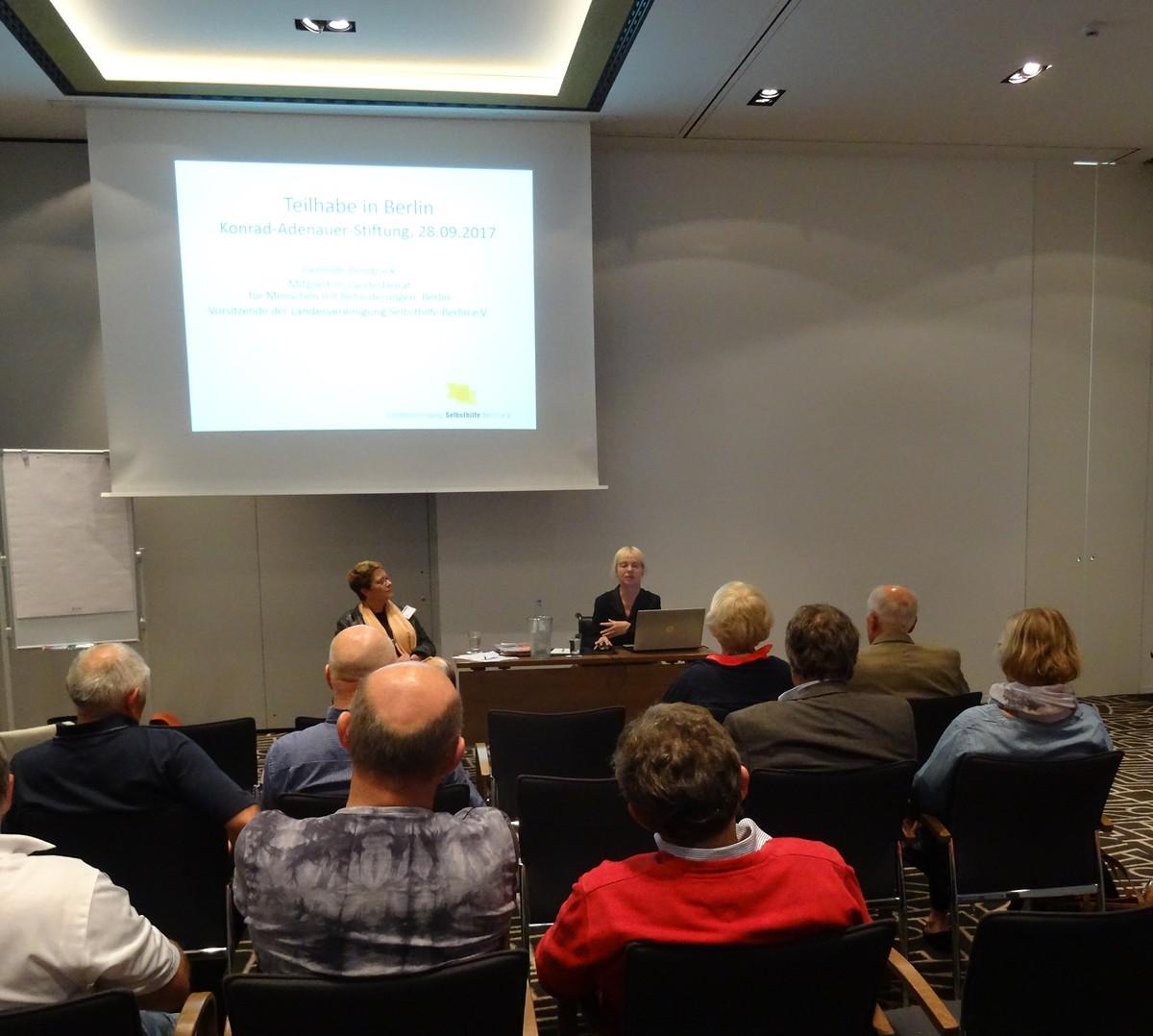 Im Anschluss referierte Gerlinde Bendzuck, Vorsitzende der Landesvereinigung Selbsthilfe Berlin e.V., über die Partizipation von Menschen mit Behinderungen bei der Umsetzung von Planungsprozessen für den öffentlichen Raum in Berlin. Sie erläuterte die Abstimmungsprozesse innerhalb der Verbände mit der Politik und berichtete über aktuelle Themen und über bereits Erreichtes. Auch hier blieb ausreichen Zeit für eine Diskussion mit den Teilnehmern.