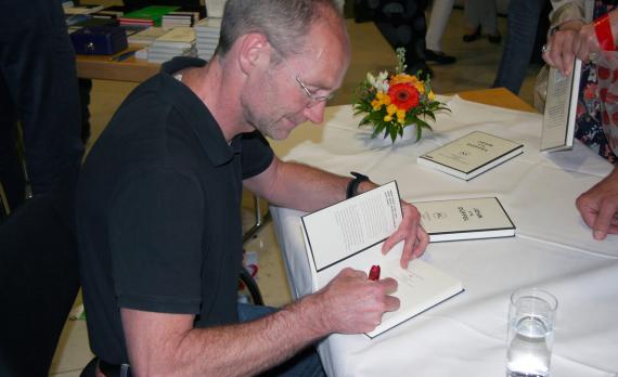 John von Düffel passt auf vortreffliche Weise in die diesjährige Reihe „Literatur & Identität“, spielt die Identität in seinem Werk doch eine tragende Rolle. In seinem aktuellen Buch steht der Protagonist KL, dessen wahre Identität verschleiert wird, exemplarisch für das Spiel mit der eigenen Identität als Fiktion seiner selbst. Ihm liegt sehr daran, seine Identität zu perfektionieren und zu konservieren, sich unsterblich zu machen. In seinem Buch „Wovon ich schreibe“ setzt sich John von Düffel sehr ausführlich mit dem Thema „Identität“ auseinander. Er führt aus, dass das Thema Identität einem Autor als erstes in der Frage nach dem Autobiographischen begegnet. Stellt sich doch jeder Leser immer wieder die Frage, wo sich das literarische Erzählen und die persönliche Erfahrung des Autors berühren. Von Düffel geht auch der Frage der Identität als Fiktion nach. Er schreibt, dass Einführungen auf seinen Lesungen für ihn insofern interessant seien, als dass der eigene Lebenslauf in Zahlen und Fakten Revue passiert und man als Autor staunend dasitzt und es sich anhört. Er betont, dass sich all diese biographischen Tatsachen auf ganz unterschiedliche Art und Weise miteinander verknüpfen – zu eben ganz unterschiedlichen Geschichten! Identität ist für ihn u.a. „das große Thema unserer Zeit“, „so etwas wie ein Widerspruch in Oszillation“ oder „etwas in Bewegung Befindliches“. Von Düffel beschreibt auch die Verwandlung, die beim Schreiben und Erzählen eintritt. „Im Erzählen, im Spiegel unserer Sprache entwerfen wir eine Figur, mit der wir nicht identisch sind.“