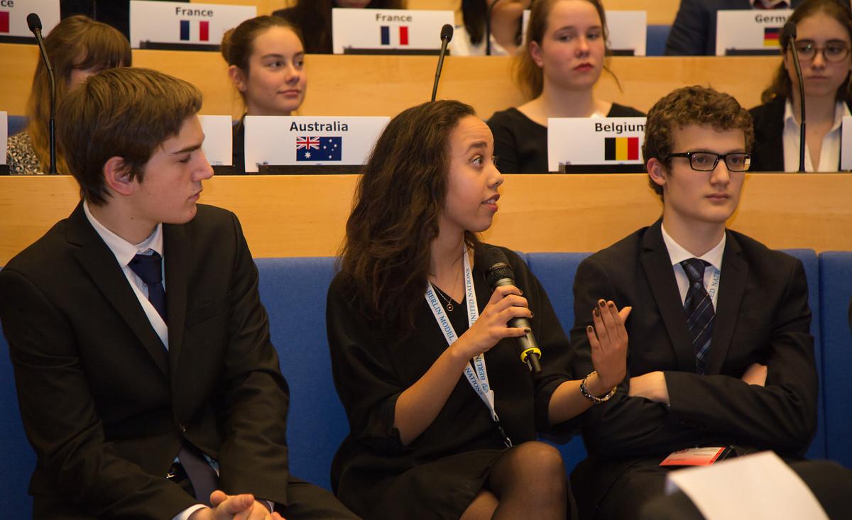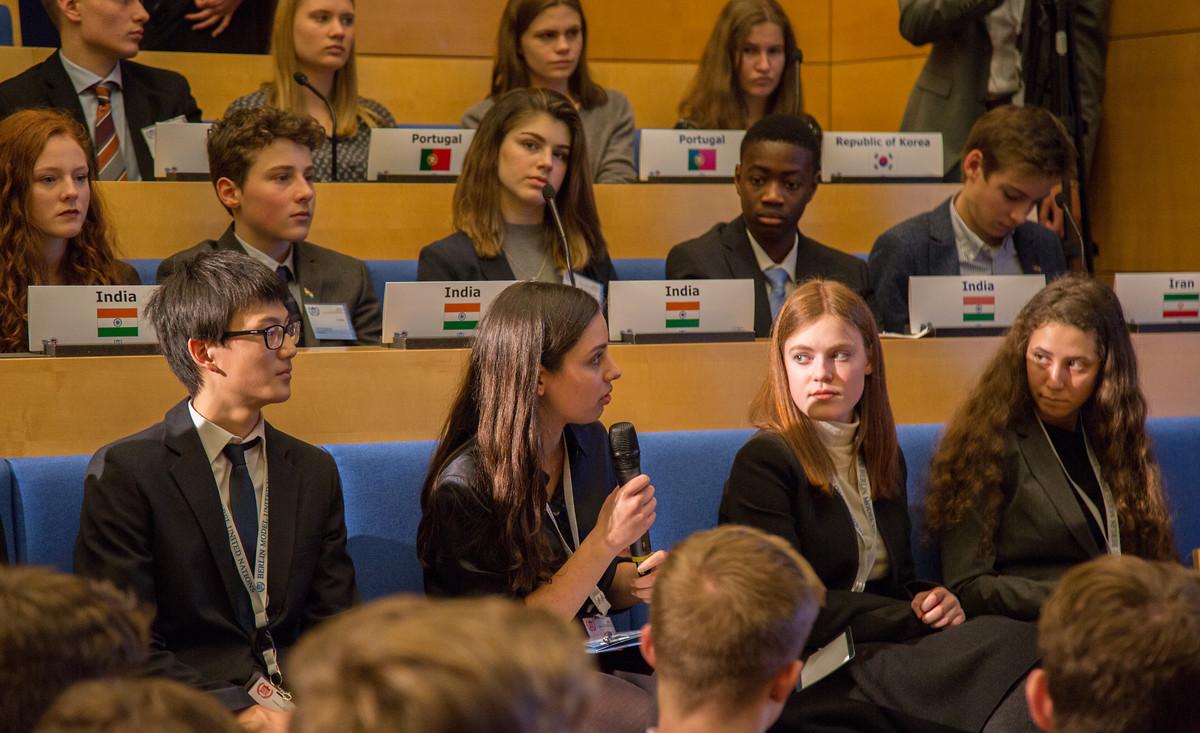 1989 wurde die BERMUN von zwei engagierten Schülern der Berliner John-F.-Kennedy Schule gegründet. Die ursprüngliche Idee war es, einen Dialog zwischen jungen Menschen im lange geteilten Berlin zu etablieren, damit gemeinsam Belange der internationalen Politik diskutiert, unterschiedliche Sichtweisen erfahren und Konsensbildung gefördert werden könnte. Das Vorbild für die BERMUN-Initiative war damals „The Hague International Model of United Nations“ (THIMUN), das eines der bislang größten und erfolgreichsten Simulationen dieser Art ist. Heute, rund 27 Jahre später, ist aber auch BERMUN weit über die Stadtgrenzen Berlins hinaus bekannt. Schüler aus aller Welt – aus den USA, Saudi-Arabien oder der Türkei – kommen nach Berlin, um an der BERMUN-Konferenz teilzunehmen. Während der Konferenz müssen sich die Schüler in die Rolle eines Vertreters eines ihnen fremden Landes hineinversetzen, sich komplexen politischen Fragestellungen widmen und schließlich einen Standpunkt dazu vertreten. Eine Aufgabe, die viel Verhandlungsgeschick, tiefgehende Rhetorikkenntnisse und Wissen über die Funktionsweisen der Vereinten Nationen erfordert. Für die jungen Menschen also eine prägende Erfahrung, die Erinnerung bleiben wird: „Ihr werdet Euch vielleicht am Ende Eurer Schullaufbahn nicht dran erinnern, was die Wurzel aus drei ist, aber Ihr werdet mit Sicherheit nicht diese Konferenz vergessen“, stimmte der Direktor der John-F.-Kennedy Schule, Brian Slater, die Schüler augenzwinkernd zum Auftakt der Veranstaltung ein.
