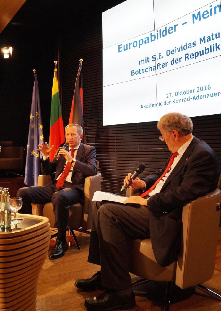 Die Krisen der EU können nur gemeinsam gelöst werden. Litauen sei bereit, Verantwortung zu übernehmen, indem es beispielsweise 1.050 Flüchtlinge aufnimmt. Das Land unterstützt auch die Haltung der Bundesregierung in Bezug auf die Finanzpolitik der EU und die Stabilisierung des Euroraumes. Aus litauischer Sicht, so der Botschafter, können die EU-Länder erst dann auf den Pfad des gesunden Wachstums kommen, wenn dringende Strukturreformen implementiert und Schulden abgebaut werden. Das litauische Beispiel zeige, dass nur mit schmerzhaften Reformen die Wettbewerbsfähigkeit der Wirtschaft wiederbelebt und damit das Fundament für den weiteren wirtschaftlichen Aufschwung geschaffen werden könne und dass es keinen Widerspruch zwischen Sparpolitik und Wachstum gebe. Litauen fühlt sich dem Norden Europas zugehörig. „Das skandinavische Entwicklungsmodell hat für uns einen erstrebenswerten Vorbildcharakter.“
