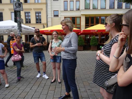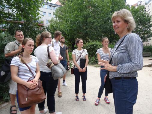 Am Hackeschen Markt, in etwa auf Höhe der alten Stadtgrenze, begann die Kunsthistorikerin Annette Uebel die Stadtchroniken mit der Geschichte der jüdischen Bevölkerung zu verknüpfen. Als im ausgehenden 12.Jahrhundert Berlin und Cölln gegründet wurden und sich später zu einer Doppelstadt zusammenschlossen, waren in dieser Region bereits jüdische Händler tätig. In den folgenden Jahrzehnten kam es jedoch immer wieder zu Ausschreitungen, Pogromen, Vertreibungen und antijüdischen Prozessen. Die sicherlich signifikanteste Veränderung setzte mit dem Edikt des Großen Kurfürsten Friedrich Wilhelm vom 21. Mai 1671 ein. 50 aus Wien vertriebenen jüdischen Familien wurde es gestattet, sich in Brandenburg anzusiedeln. Als Gründungsdatum der Berliner Jüdischen Gemeinde gilt der 10. September desselben Jahres.
