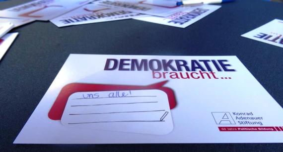 Ziel war es mit den Passanten ins Gespräch zu kommen und gemeinsam eine Antwort auf die Frage "Was braucht Demokratie?" zu finden.