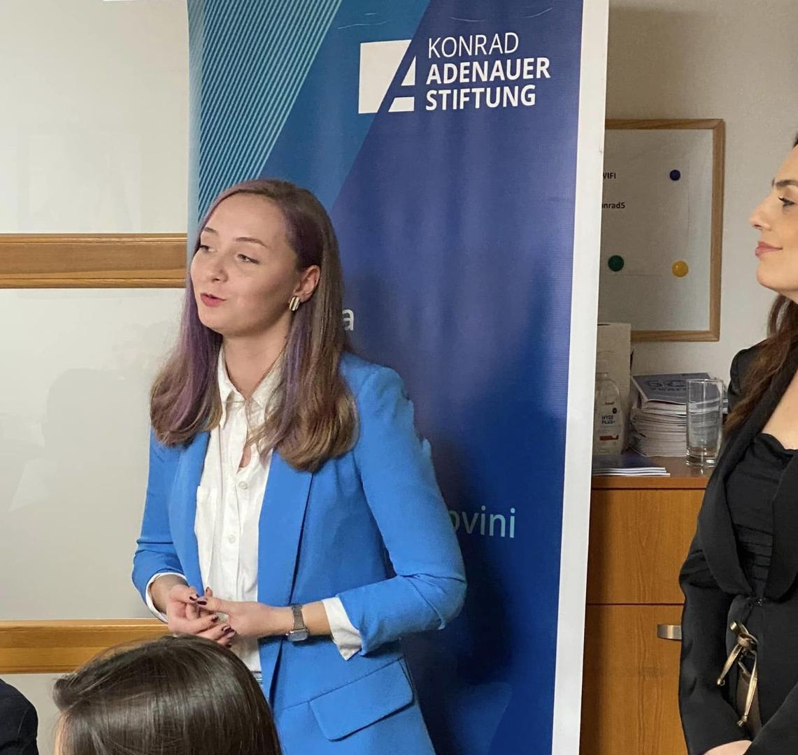 „Ich bin Berina Bulatović. Ich bin Vorstandsmitglied im Alumni-Club der KAS in BiH. Ich habe 2021 mein Studium an der Philosophischen Fakultät der Universität Sarajevo am Fachbereich Psychologie abgeschlossen und mich anschließend für einen Masterstudiengang am selben Fachbereich eingeschrieben. Ich bin seit etwas mehr als 7 Jahren im NGO-Sektor durch mehrere Organisationen aktiv. Am bemerkenswertesten ist dabei Youth for Peace, eine Jugendorganisation, die sich mit der Schaffung von nachhaltigem Frieden und sozialem Zusammenhalt in Bosnien und Herzegowina befasst. Ich arbeite im Jugendrat FBiH, dem Dachverband der Jugend auf FBiH-Ebene, der anerkannt ist durch das FBiH-Jugendgesetz. Ein Thema, das ich in meiner Arbeit oft anspreche und das mir besonders am Herzen liegt, ist die psychische Gesundheit junger Menschen und die Stärkung ihrer Leistungsfähigkeit.“