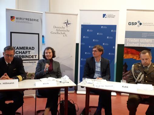 Unter der Moderation von Anna-Lena Kirch von der Hertie School of Governance diskutieren an der Universität der Kommandeur des Zentrums für Militärgeschichte und Sozialwissenschaften der Bundeswehr, Kapitän zur See Dr. Jörg Hillmann, der estnische Verteidigungsattaché Oberstleutnant i.G. Martin Kukk sowie der Inhaber des Lehrstuhls für Militärgeschichte an der Universität Potsdam, Prof. Dr. Sönke Neitzel.