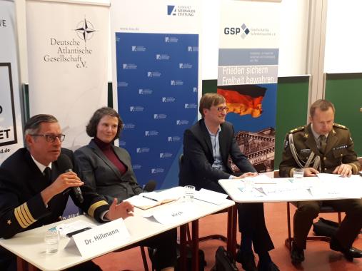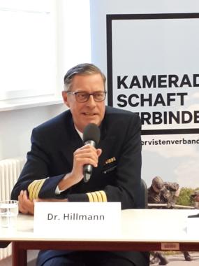 Kapitän zur See Hillmann sieht in der gemeinsamen Zusammenarbeit in der Europäischen Union viele Vorteile, die weiter ausgebaut werden müssten, zugleich aber auch einige strukturelle Probleme. Die Deutschen seien mit dem Herz vor allem in der NATO, die Offiziere seien durch diese Erfahrung in ihren Laufbahnen geprägt. In Brüssel bei der EU säßen lediglich 390 Militärs unter nahezu 30000 Beamten. Klar sei, dass die Vision einer europäischen Armee nur in einer langfristigen Perspektive (über dreißig Jahre) interessant sei. Gemeinsame Rüstungsprojekte seien sinnvoll, allerdings sehr schwierig und problembehaftet. Ein gemeinsamer Rüstungsmarkt sollte in langfristiger Sicht ins Leben gerufen werden, alle Nationen müssten zu der Suche nach Lösungen beitragen. Kapitän Hillmann betonte, dass jüngste Umfragen des ZMSBw zeigten, dass die Deutschen die Bundeswehr überwiegend positiv sehen. 90 Prozent seien für eine engere Zusammenarbeit innerhalb der Europäischen Union. Vielleicht traue also die Politik der Bevölkerung zu wenig zu, wenn gewisse Debatten über sicherheitspolitische Fragen kaum geführt würden. Über den Austritt Großbritanniens aus der Europäischen Union seien viele in Brüssel bei der Europäischen Union tätige Offiziere froh, hätten doch die Engländer in den vergangenen Jahren oft gebremst.