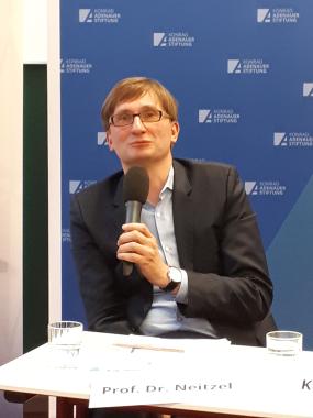 Professor Dr. Neitzel mahnte, auf lange Sicht müsse man zu Mehrheitsentscheidungen innerhalb der EU kommen, da sei Deutschland mit Blick auf die Bundeswehr jedoch ein „massiver Bremsklotz“. Sicherheitspolitisch sei Deutschland „Trittbrettfahrer“, es wolle nicht wirklich einsatzbereite Streitkräfte unterhalten, die im Fall des Falles auch kämpfen können. Die Militärs sagen, es sei nicht ihre Aufgabe, solche Debatten zu führen, sondern die Aufgabe der Politik; frage man bei Verteidigungsausschuss des Bundestages, erhielte man aber ebenfalls keine Antwort. Es gehe jedoch darum, die Frage zu klären: Wofür wollen wir Streitkräfte einsetzen? Er bemängelte das „Strategiedefizit“ in der deutschen Politik und Gesellschaft. Der NATO verspreche Deutschland drei Divisionen, mit einem wirklichen Einsatz dieser werde aber offenbar nicht gerechnet, denn die Divisionen seien nicht einsatzbereit. In vielen europäischen Partnerländen stelle man sich die Frage, was machen eigentlich die Deutschen, wenn es im Baltikum „knallt“? Die Haltung in Deutschland werde sich erst ändern, wenn der Druck steige, etwa die USA die NATO verließen.
