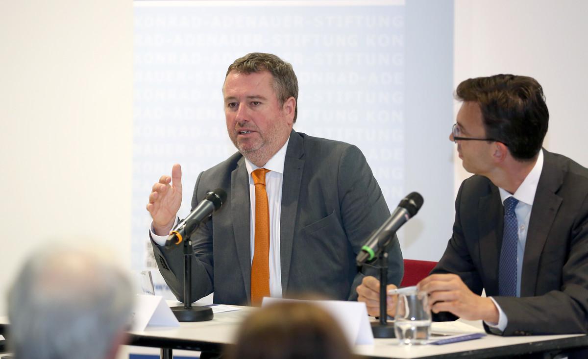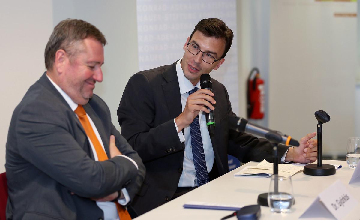 Mehrmals kam Györkös an diesem Abend auf einen der momentan größten Streitpunkte zu sprechen: die europäische Flüchtlingsquote, die „Zwangsverteilung“, wie Ungarn sie nennt. Mit der Position seines Landes gegen eine automatische Verteilung von Flüchtlingen werde auch Ungarns europäische Solidarität in Frage gestellt. Diesem Vorwurf entgegnete Györkös, dass vorher die Kontrolle der EU-Außengrenzen gewährleistet sein müsse. Zudem investiere Ungarn mehr als die anderen EU-Länder in die Sicherung der europäischen Außengrenzen und bekämpfe Fluchtursachen, indem es Soldaten in NATO-Stabilisierungseinsätze nach Afghanistan und auf den Balkan entsende. Statt nur Kritik für seine Politik zu ernten, wünsche sich Ungarn einen anderen Blick auf sein Land, gerade aus der Mitte Europas: Deutschland solle die Visegrád-Staaten verstärkt als Wirtschaftspartner wertschätzen. Es habe schon seine historische Richtigkeit, dass Frankreich Deutschlands Wirtschaftspartner Nummer Eins sei, doch Polen, Tschechien, die Slowakei und eben Ungarn wiesen ein höheres Wirtschaftswachstum bei etwa der gleichen Einwohnerzahl auf. So fasste Györkös seine Bitte in wenigen Worten zusammen: „Mehr Aufmerksamkeit Richtung Osten“.