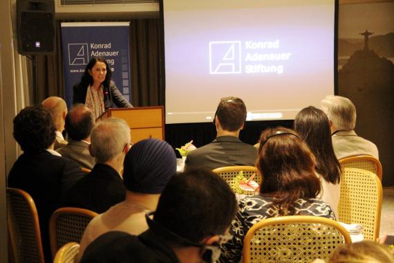 Die Bundestagsabgeordnete betonte zu Beginn ihres Vortrags, dass im Mittelpunkt der Politik immer der Mensch stehe und, dass es aus diesem Grund wichtig sei, das Vertrauen der Bevölkerung in das politische System zu bewahren. Die wichtigste Funktion des Wahlsystems sei die Repräsentation der Gesellschaft, welche auf effektive Art und Weise nur innerhalb einer Demokratie garantiert werden könne. Frau Winkelmeier-Becker hob spezielle Aspekte des deutschen politischen Systems wie die Fünf-Prozent-Hürde, das Modell der Wahlkreise und das Finanzierungssystem von Parteien hervor. Eine rege Diskussion im Anschluss an die Präsentation und viele Kommentare und Fragen aus dem Publikum sprachen für das große Interesse am deutschen politischen System, welches mit der aktuellen Situation in Brasilien verglichen wurde.
