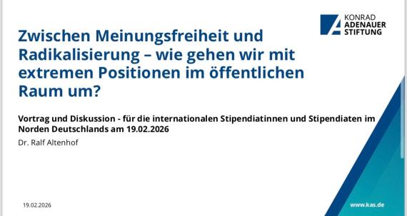 Am 19. Februar lud die Konrad-Adenauer-Stiftung Bremen im Rahmen einer Bildungsveranstaltung der internationalen KAS-Stipendiatinnen und Stipendiaten im Nordern Deutschlands ein zu einem Onlinevortrag von Dr. Ralf Altenhof zu dem Thema „Zwischen Meinungsfreiheit und Radikalisierung – wie gehen wir mit extremen Positionen im öffentlichen Raum um?“.