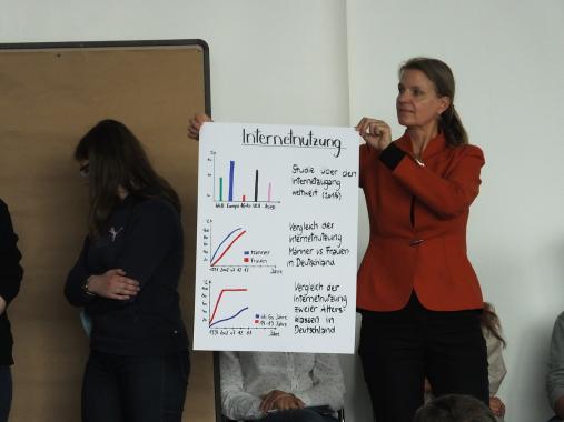 Die Schülerinnen und Schüler des Workshops „Soziale Medien als Jungbrunnen der Demokratie?“ untersuchten unter anderem Online-Partizipationsmöglichkeiten hinsichtlich der Fragen „Wer beteiligt sich im Netz?“ und „Welche Partizipationsformen gibt es?“. Mit Blick auf den Bundestagswahlkampf 2017 sowie den US-Wahlkampf 2016 verdeutlichten sie Chancen, die soziale Medien für die Demokratie bieten, und ebenso welches Gefahrenpotenzial in Facebook, Twitter und Co steckt. Marianne Kneuer machte ihre Workshopteilnehmer darauf aufmerksam, dass sie die „informationsprivilegierte Generation“ seien. Niemals zuvor standen Informationen in vergleichbarer Menge und Breite zur Verfügung. Dennoch wären gerade diese „Superprivilegierten“ zu wenig informiert, so Kneuer.