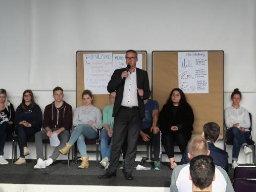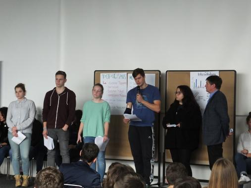 Thorsten Müller erklärte im Workshop „Populismus als Korrektiv?“ den Schülerinnen und Schülern zuerst, dass Populismus nicht gleichbedeutend mit Extremismus ist, es jedoch sein kann. Populismus übertreibt, dramatisiert, überspritzt und ist voller Emotionen. Populisten zeigen sich volksnah und versuchen „Dinge auf den Punkt zu bringen“. Die Jugendlichen zeigten in ihrer Präsentation, dass sich auch die Volksparteien CDU und SPD sowie Parteien wie die FDP und Bündnis 90/Die Grünen insbesondere auf Wahlplakaten und in ihren Reden populistischer Mittel bedienen.