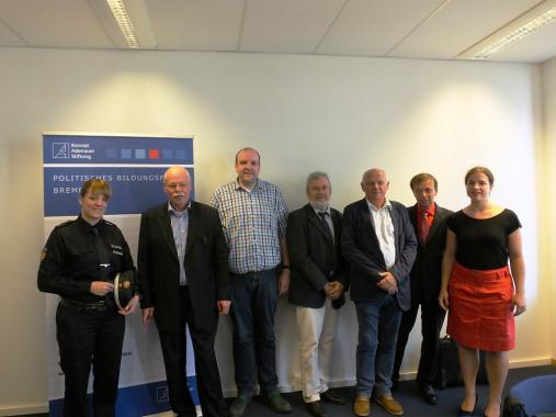 Auf dem Podium diskutierten Maike Buggel, Polizeikommissarin bei der Schutzpolizei Bremen, Wilhelm Hinners, Innenpolitischer Sprecher der CDU in der Bremischen Bürgerschaft, Ulrich Mäurer, Senator für Inneres (SPD), Wilko Zicht, Innenpolitischer Sprecher der Grünen in der Bremischen Bürgerschaft, sowie Dr. Gustav Zoller, Dozent an der Deutschen Hochschule der Polizei. Moderiert wurde die Veranstaltung von Ralf Michel, Redakteur beim Weser-Kurier. Rund 125 Bremerinnen und Bremer zeigten sich im voll besetzten Veranstaltungssaal hoch interessiert an der Thematik.