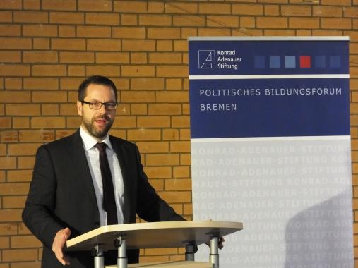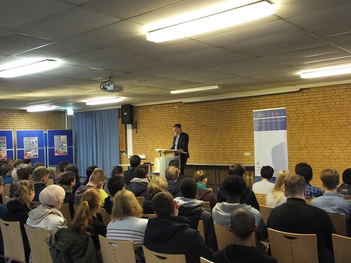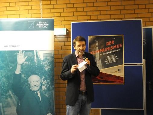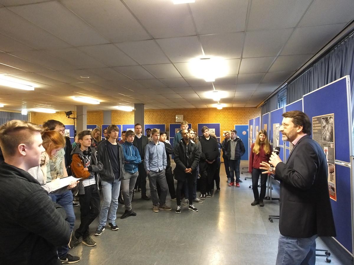 Schuldirektor Tobias Weigelt begrüßte die Schülerinnen und Schüler zuerst und betonte, wie „weit entfernt“ das Thema der Ausstellung für die Teilnehmer sei. Er selbst habe in den 1980er Jahren die allgegenwärtige Furcht vor einem atomaren Krieg gespürt, ebenso die globale Spaltung in zwei Lager. „Die Ausstellung stellt Aufstieg und Niedergang der kommunistischen Bewegung dar“, erklärte Ralf Altenhof, „der Kommunismus ist eine gefährliche Ideologie, die weltweit mehr als 100 Millionen Opfer forderte“. An den Beispielen China, Nordkorea und Kuba verdeutlichte der Leiter des Politischen Bildungsforums Bremen die aktuelle Relevanz des Kommunismus.