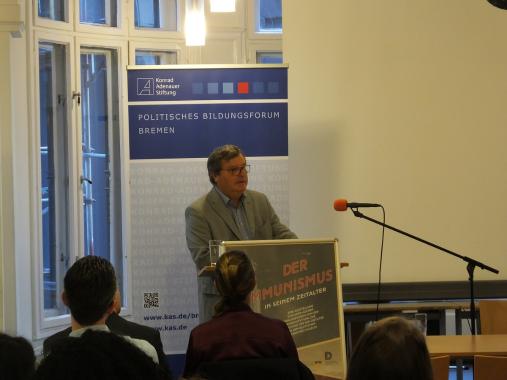 Gleich zweimal eröffnete die Konrad-Adenauer-Stiftung (KAS) am 16. Januar die Ausstellung „Der Kommunismus in seinem Zeitalter“ des Historikers Gerd Koenen an Bremer Schulen. Nach einer Begrüßung durch die jeweilige Schule und einer kurzen Einleitung durch den Tagungsleiter der KAS, Marcus Oberstedt, berichtete Dr. Werner Müller, vormals Professor für Geschichte an der Universität Rostock, den interessierten Schülerinnen und Schülern der beiden Bildungsstätten vom rasanten Aufstieg und anhaltendem Niedergang der kommunistischen Weltbewegung.