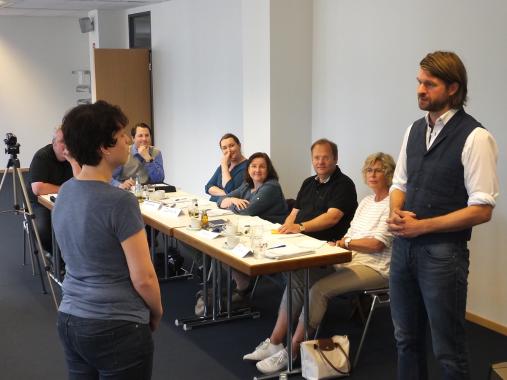 In verschiedenen praktischen Sprach- und Redeübungen konnten die Teilnehmer ihre Fähigkeiten trainieren und verbessern. Hauptaugenmerk lag bei den Übungen auf der Selbstpräsentation. Außerdem wurden Ein- und Ausstiegmöglichkeiten für Vorträge geübt und Tipps im Umgang mit Nervosität behandelt. Einzelne Übungen wurden dabei auf Video aufgenommen und im Anschluss durch die Gruppe und Trainer Dieball analysiert. Immer wieder hatten die Teilnehmer die Möglichkeit, zuvor erlerntes Wissen, vor der ganzen Gruppe, aber auch in kleineren Gruppen, zu trainieren. Jeder Seminarteilnehmer hatte dadurch die Möglichkeit, seine eigenen Kommunikations- und Verhaltensmuster und seine Wirkung bewusst wahrzunehmen.