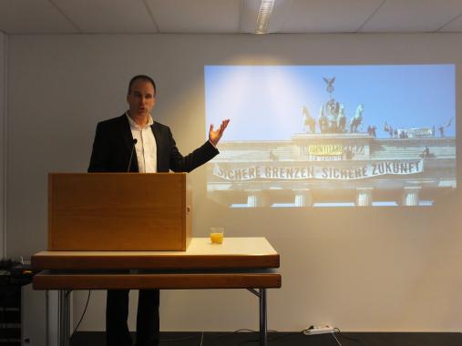 Stefan Ravens, selbst Altstipendiat der Konrad-Adenauer-Stiftung, begann seinen Vortrag mit einer Beschreibung der Rechte und Pflichten des Verfassungsschutzes, wobei er großen Wert auf die Unterschiede und Gemeinsamkeiten mit der Arbeit der Polizei legte. Die „Identitäre Bewegung“ beschrieb Ravens als „sehr dynamische“ Gruppierung, die anstelle von „Springerstiefeln und Bomberjacken“ lieber auf ein „Schwiegersohn-Image“ setzt, ein Trend, der sich in der rechtsextremen Szene seit einigen Jahren auf dem Vormarsch befindet. Zudem seien die Einsätze der „Identitären“, wie zum Beispiel besagte Erklimmung des Brandenburger Tors, reine PR-Aktionen, die eher darauf abzielen junge Menschen durch die „sportlichen“ -und nicht die politischen Aspekte anzulocken. Darüber hinaus sind diese, in sozialen Medien oft gefeierten, Aktionen lediglich „eine Sache von zwei Minuten“, so Ravens. „Die stellen sich da hin, machen das Foto und sind wieder weg“, bevor es Probleme mit Anwohnern, Personal oder der Polizei gibt. Die Mitglieder der „Identitären Bewegung“, die zu großen Teilen aus der NPD und anderen rechten Gruppierungen stammen, setzen auch darauf gewaltfrei zu bleiben, um bei Außenstehenden als friedlich und rational zu gelten.