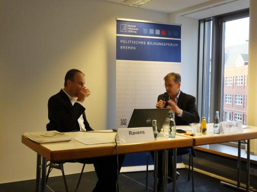 Unmittelbar nach der Präsentation ging es für Stefan Ravens in ein Gespräch, in dem Ralf Altenhof unter anderem Fragen zur Charakterisierung der „Identitären Bewegung“ als „heiße Nummer“ durch den Verfassungsschutz, die Rolle der Reichsbürger im Rechtsextremismus sowie die Zukunft der „Identitären Bewegung“ stellte. Stefan Ravens erklärte, dass durch den Zulauf aus rechtsextremen Gruppierungen hin zur „Identitären Bewegung“ sowie durch die vorangegangenen Erfahrungen mit der Bewegung in Frankreich und Österreich die Entscheidung, sie als „rechtsextremistisch“ einzustufen, schnell gefasst werden konnte. Die Reichsbürger seien wiederum eine andere Sache, da zwar Einige zum rechtsextremistischen Lager gehören, aber auch ein großer Teil von ihnen geistig verwirrt und eher auf sich selbst bezogen sei. Für die Zukunft wollte Ravens noch keine Prognose verkünden, da niemand wissen könne, wie sich diese Gruppierungen entwickeln, sicher sei nur, dass sie sich bald was Neues ausdenken müssen, denn auch Klettern „wird irgendwann langweilig“. Auf die Frage hin warum im aktuellen Verfassungsschutzbericht Bremens zwar die gewaltlosen sowie die gewaltbereiten rechten Gruppen, aus dem linken Spektrum aber lediglich die gewaltbereiten Bewegungen aufgeführt sind, verwies Ravens auf die begrenzten Mittel des Verfassungsschutzes in Bremen und dass in solchen Fällen Prioritäten gesetzt werden müssten.