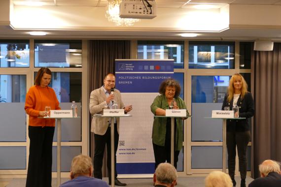Danach fand ein Podiumsgespräch statt, bei dem Görner und Morawietz ihr Engagement für die Älteren betonten und Oppermann auf diverse Hilfsangebote der Sparkasse verwies. Zum einen plane die Sparkasse in Bremen weiterhin 20 Filialen zu betreiben, welche besonders „da, wo die Menschen sind“, d.h. u.a. in Wohnquartieren, lägen. Außerdem gäbe es inzwischen nicht nur eine 24-Stunden-Hotline für Sparkassenkunden, sondern auch einen „Bargeld-Lieferdienst“. Diese Angebote seien jedoch durch die Coronapandemie kaum bekannt.