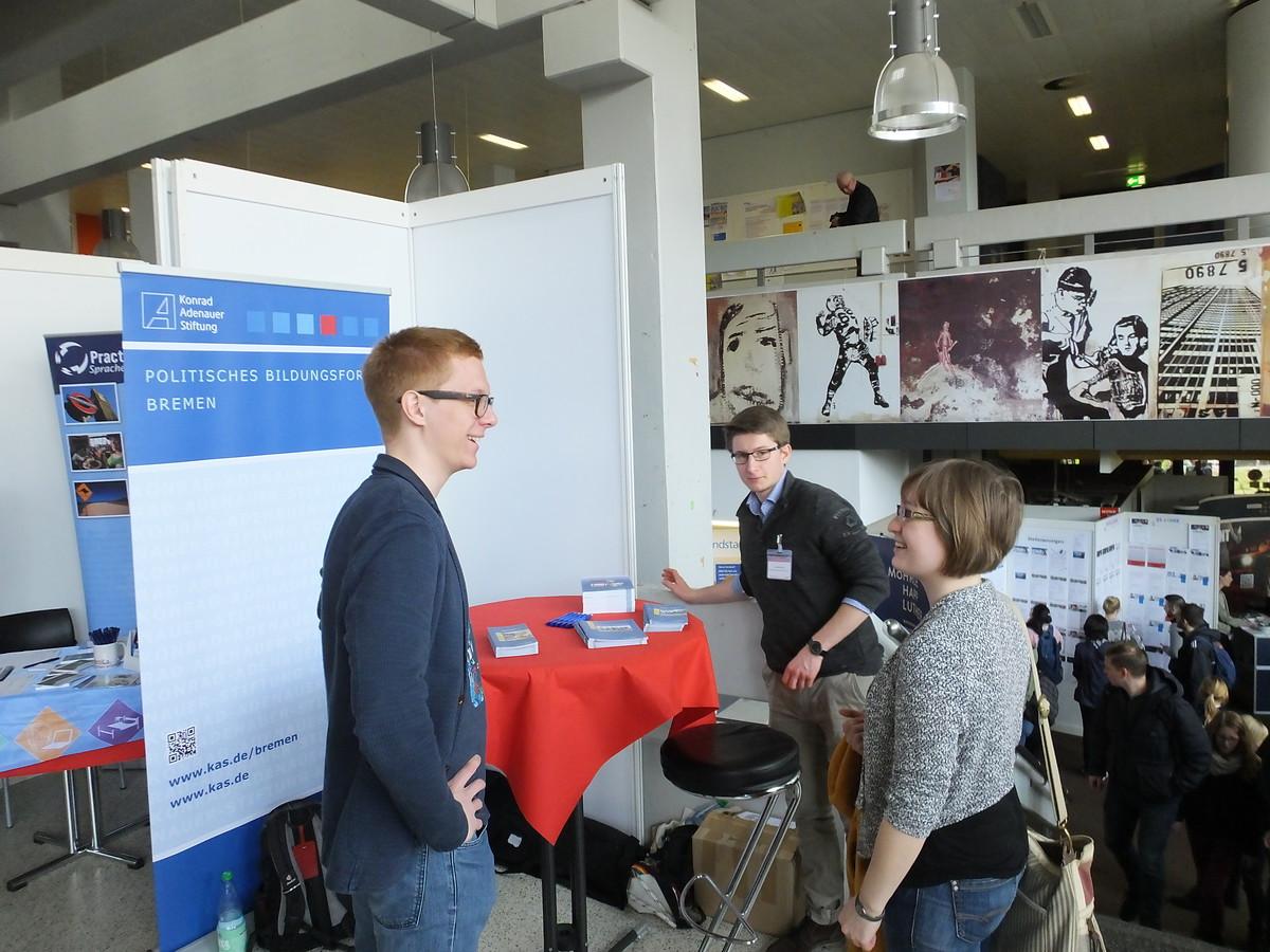 Gemeinsam mit zahlreichen anderen Unternehmen und Organisationen gab die KAS einen Überblick über die Möglichkeiten der Förderung und Weiterbildung, die sich Studierenden während des Studiums und im Anschluss daran bieten. Im Gespräch mit Konstantin Krome, Jonas Pauly, Luisa Schmidt-Rave und Jonathan Merz, Bremer Stipendiaten der KAS, sowie Hendrik Pröhl, FPJler im Bildungsforum Bremen, konnten die Interessierten sich über die Studienförderung, das Bewerbungsverfahren sowie studienbegleitende Praktika informieren. Auch die Arbeit der KAS in Bremen, Deutschland und international wurde im regen Austausch mit den Studierenden vorgestellt.