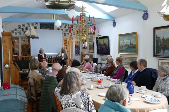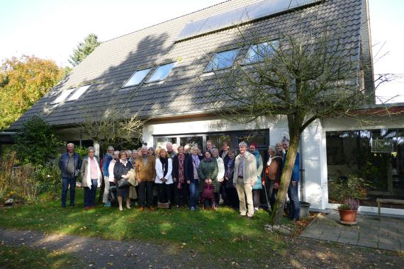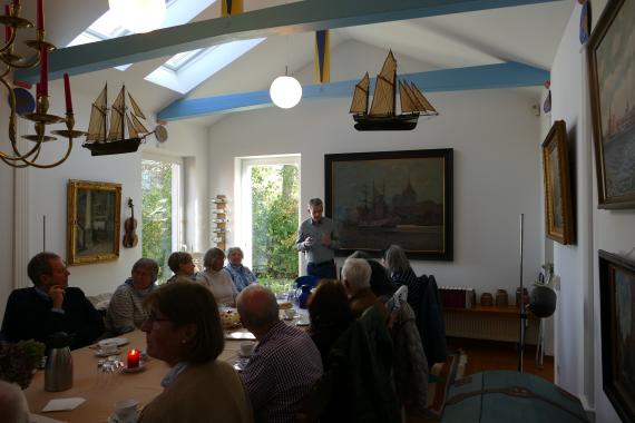 Beim Haus angekommen wurden die Teilnehmenden von den Gästeführerinnen Irmela von Lenthe und Alinda van der Vooren-Tralau begrüßt. Nach einem Gruppenfoto wurde zu Kaffee und Kuchen im Rostock-Zimmer eingeladen. Dieses Zimmer hat eine besondere Bedeutung, denn es war nicht nur das ehemalige Archiv, sondern es widerspiegelte die verlorene Jugend und Heimat des Schriftstellers Walter Kempowski.