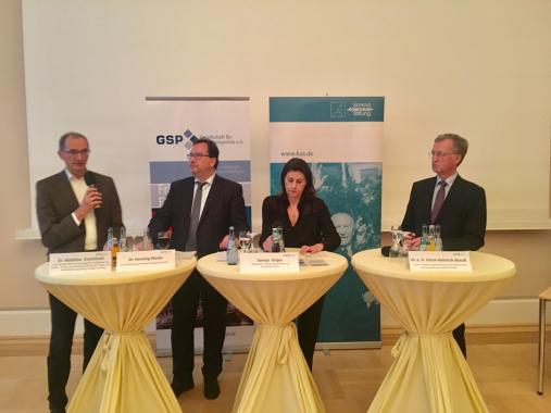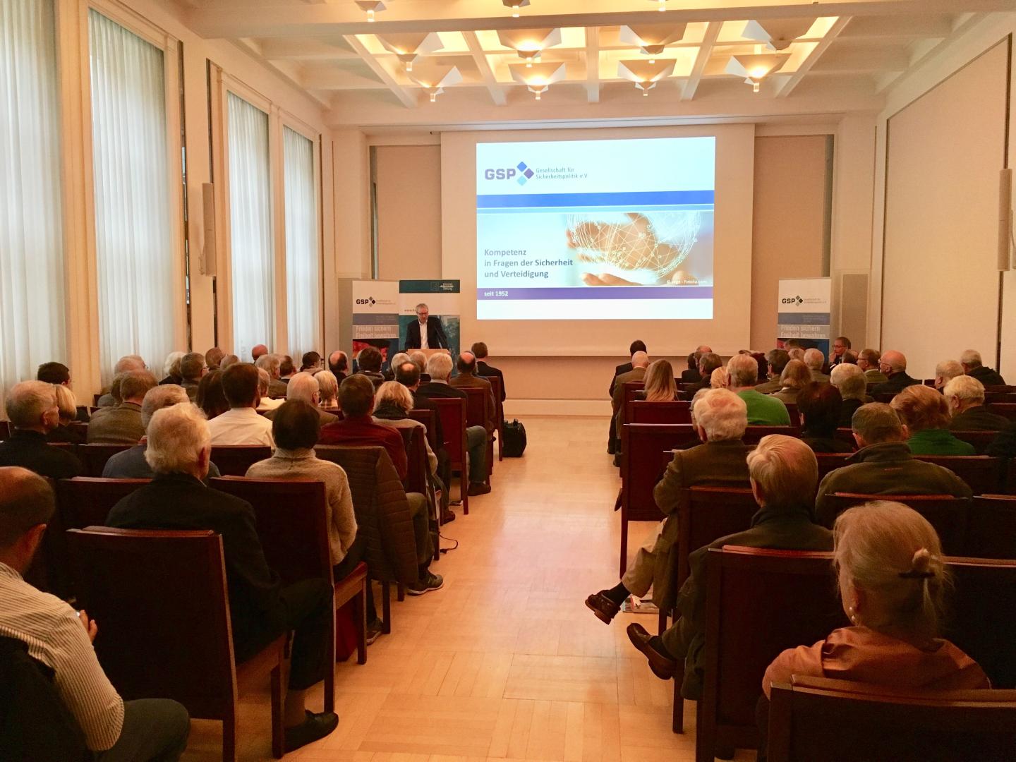 Nach einer thematischen Einführung durch den Präsidenten der GSP, Prof. Dr. Johannes Varwick, folgten Impulsvorträge. Dr. Oliver Meier, stv. Forschungsgruppenleiter Sicherheitspolitik bei der SWP in Berlin, untersuchte, wie sich Europa wirkungsvoll gegen Nuklearwaffen verteidigen könnte, nachdem die USA den INF-Vertrag gekündigt haben. Generalleutnant a.D. Horst-Heinrich Brauß, der bei der NATO für Sicherheitspolitik und Streitkräfteplanung zuständig war, beschäftigte sich mit der Frage, ob die NATO noch gebraucht würde und mit der Zukunft der transatlantischen Beziehungen. Dr. Matthias Dembinski vom Leibniz-Institut der Hessischen Stiftung für Friedens- und Konfliktforschung in Frankfurt am Main analysierte, ob eine europäische Armee ein wirkungsvolles Verteidigungsinstrument ist. Alle Referenten sahen in einer immer engeren Zusammenarbeit in der EU auf dem Gebiet der Sicherheits- und Verteidungspolitik keinen Gegensatz zur NATO, sondern vielmehr eine Ergänzung. In der der Paneldiskussion am Nachmittag vorgeschalteten Keynote von Dr. Henning Riecke, Leiter der Studiengruppen Sicherheitspolitik der DGAP, Berlin, ging es um die „EUropäische Verteidigung 2030“. Dabei fasste er die drei Analysen vom Vormittag noch einmal kurz zusammen. Nach jedem Impulsvortrag und der Keynote hatten die Gäste Gelegenheit, zwei bis drei Fragen zu stellen. In der letzten Stunde folgte das Panel „EUropäische Verteidigung – Was ist zu tun?“, an der alle Referenten des Tages teilnahmen. Das Panel moderierte Svenja Sinjen von der Stiftung Wissenschaft und Demokratie, Berlin. Zum Ende konnten die Gäste ihre Fragen zu aktuellen Themen der Sicherheitspolitik wie Russland, China und der atomaren Bedrohung stellen.