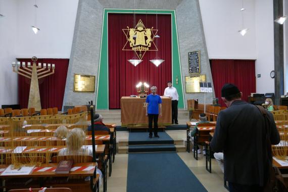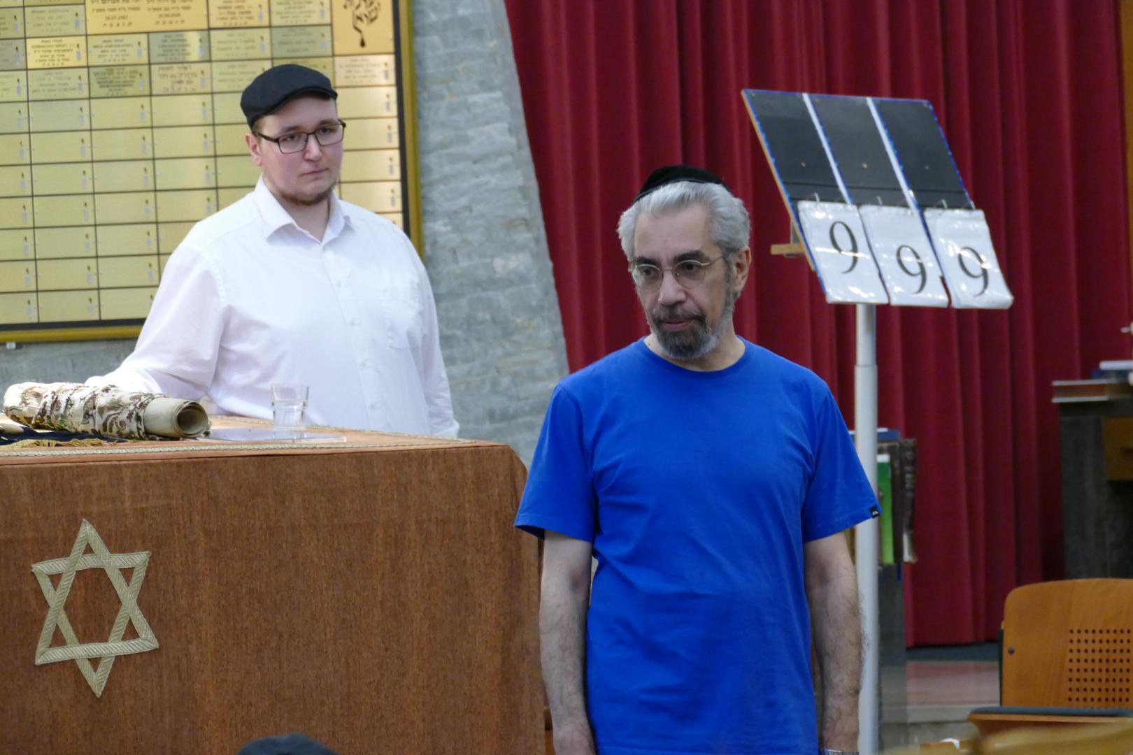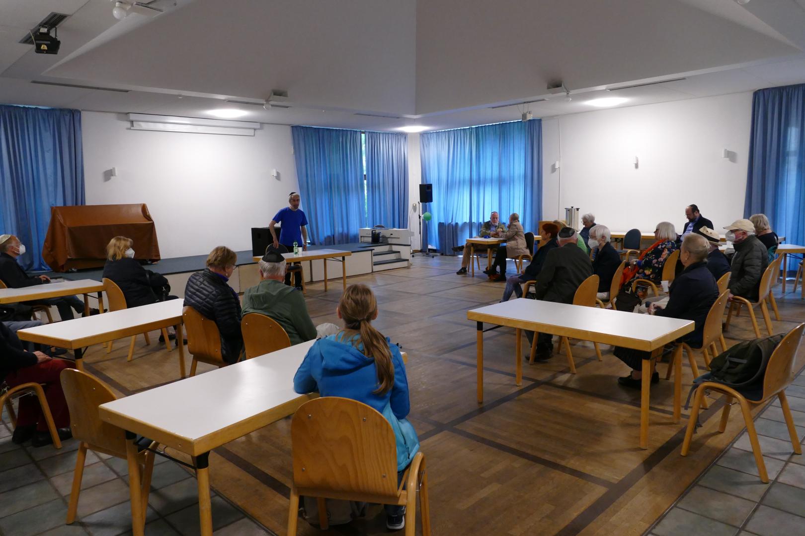 Israel Cammann begann seinen Kurzvortrag, indem er den Aufbau des Gottesdienstraums erläuterte: das Lesepult in etwa, auf welchem die Tora gelesen wird, befinde sich in der Mitte des Raumes, mit den Bänken und Stühlen drum herum. Der Leser der Tora, der sogenannte „Chatan Tora“, lese mit dem Rücken zur Gemeinde aus der Tora, nicht nur um das Gemeinschaftsgefühl zu stärken, sondern nach der Leitidee „Gott ist immer vor mir“.